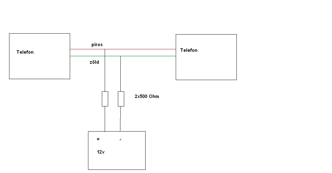Így van ezzel nem tudsz csörögni csak beszélgetni csináltuk egy időben hogy 3-4 9voltos elemet sorba kotottunk foldet eggyesitettuk es mikor csorogni akartunk akkor egy mikrokapcsoloval ranyomtuk a pozitivra es vinnyogot mint atom de en is azt javaslom hogy a madzagon osszekotott telokat razd meg mert ugy tuti hangos lesz a dolog egyébként az elso rajz is ezen alapul marmint amit mondtam szoval probalgasd csak baja nem lesz csak ne forditsd meg a polaritast azt nem szereti