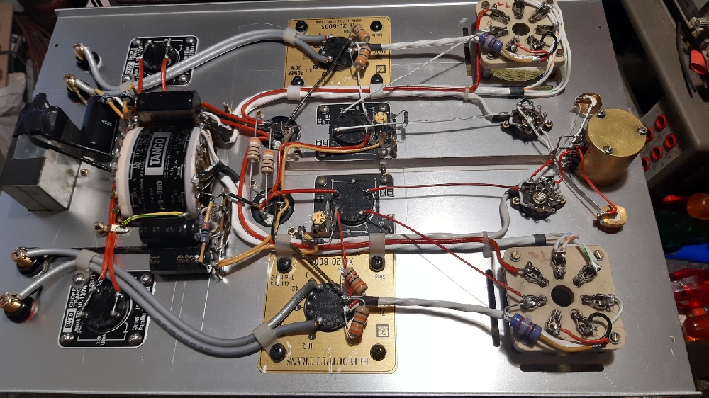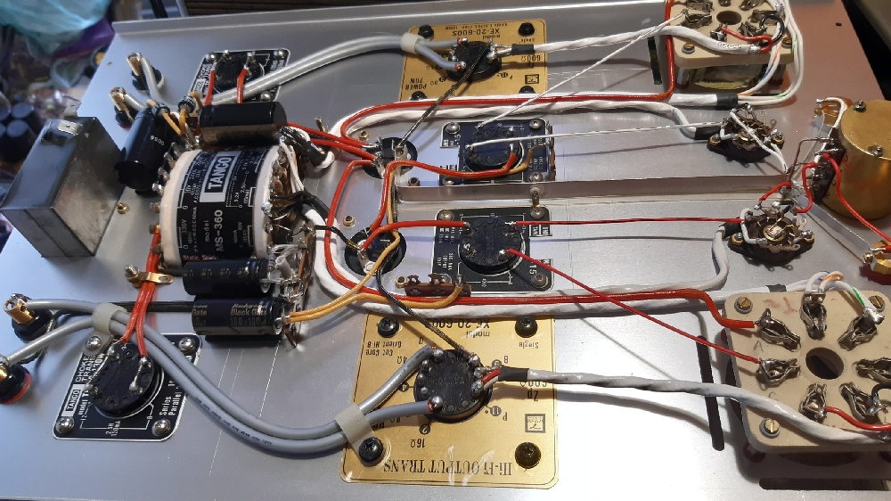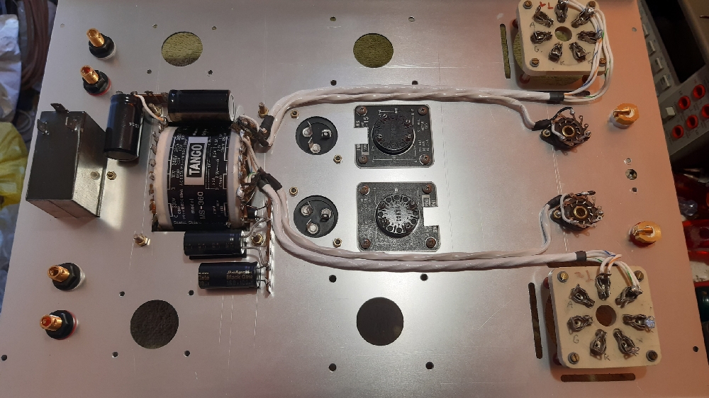 A mai napon eddig a WE 417A és a Tung-Sol 7242 elektroncsövek fűtését kábeleztem be. Nem vezetékeztem, hanem a katonai és repülőgépekhez használt MIL27500 tipusú, árnyékolt és ezüstözött vezetékeket tartalmazó kábeleket faragtam a helyükre.