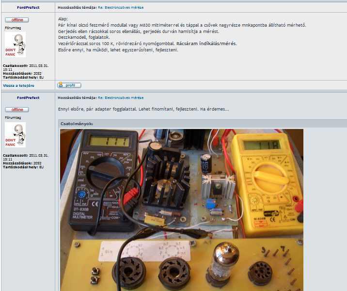 Idézet: „A ráccsal soros 100K-n mérem a feszültség változást kapcsolóval rövidre zárva/nyitva. Ebből rácsfeszültség számítható, az anódáram változás mérhető. Ebből számolható sok paraméter.” Furcsa, de én ebből nem láttam rácsáram MÉRÉST. A negatív rácsfeszültséget minek számolgatod, mikor az adott értéket többnyire tudatosan állítja elő az ember a méréskor? Az ellenállás rövidrezárogatás pedig csak "gáz TESZT", ami igaz összefügg a rácsárammal, de nem mérés! Te mérési eredményt emlegetted, ill. ennek hiányát mint probléma.