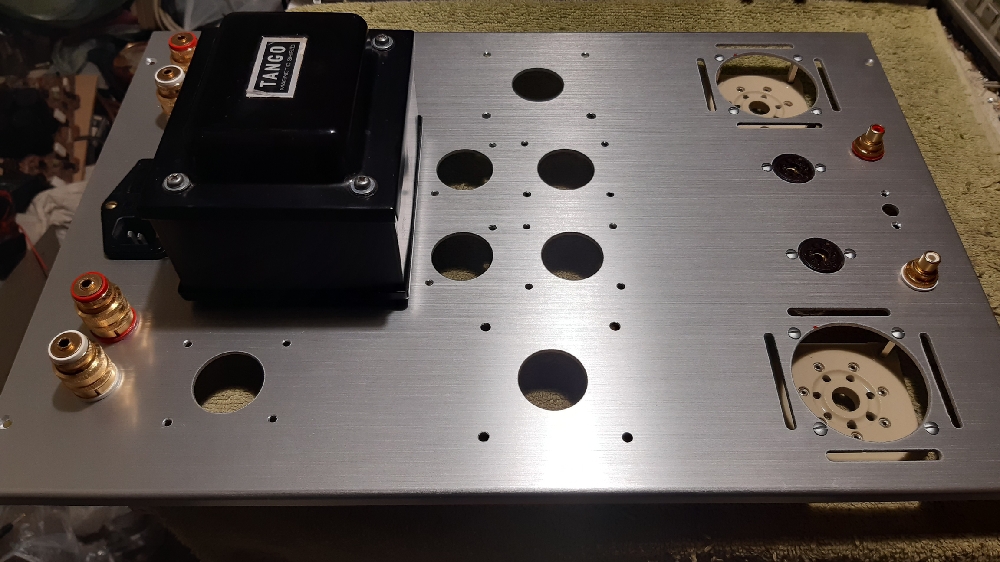 ![]() Miután beszereltem a potit a helyére, jött a földelés ezüstszalagja, amit néhány furat segítségével rőgzítettem. Következett a jelvezetékezés (Kondo KSL SPz), majd végül a Tango kimenőtrafók is a helyükre kerültek. TJ.