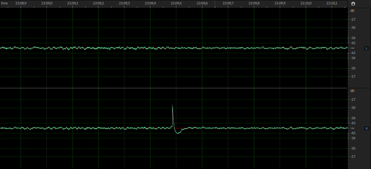 Van egy vissza térő audió zavar problémám, amire képtelen vagyok rájönni, honnan eredhet. Itt csak azért teszem fel a kérdést, hátha találkozott már valaki ilyen jelenséggel, és tudja mi okozza. Szóval adott az én sztereó mikrofonom, ami teljesen logikátlanul, alaptalanul produkál, az alábbi képen látható hirtelen impulzus kiugrást, teljesen véletlenszerűen. Én két dolgot tudok elképzelni. 1. a mikrofon köré tekert alufólia mozdul egyet, és ez okoz egy impulzust 2. vagy statikus kisülés??!?!