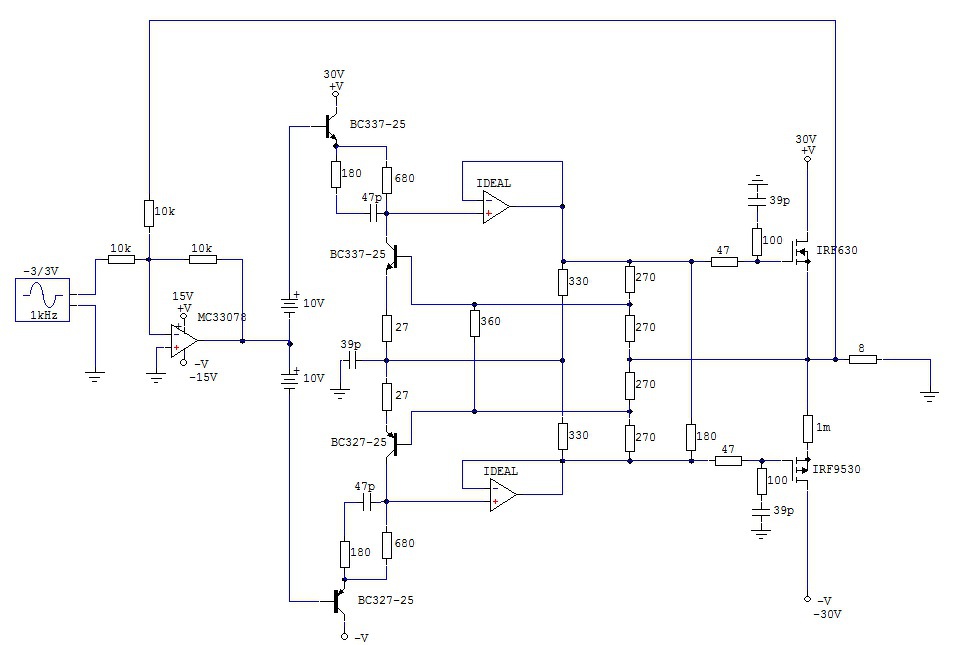 Annyira jó az eredeti ötlet, hogy nagyon megéri foglalkozni vele. Ami eddig lejött, hogy a jó hibakorrekciónak az az alapja, hogy a hibajel erősítőnek ne legyen se bemenő, se kimenő jele. Pontosabban ha veszünk egy ideálishoz közeli műveleti erősítőt vagy bármilyen erősítő fokozatot ami a fő jelútban dolgozik, az pusztán negatív visszacsatolással csökkenteni tudná a kimeneti fokozat hibáit, de mivel maga is részt vesz a teljes bemeneti jel átvitelében, nem tud a saját torzítása alá menni. Viszont ha olyan helyre kerül ez az erősítő fokozat (ami akár egyetlen tranzisztor is lehet) ahol csak a hibajelet kapja, nem kell alacsony torzításúnak lennie. A gondolatom amit meg szeretnék nézni legalább szimulációs szinten az, hogy ha földelt kimenetű erősítőt javítanánk ilyen megoldással, hogy viselkedne. A földelt kimenetű topológia csupán azért érdekelne ebben a körben, mert a hibakorrekciót rá lehetne bízni egy műveleti erősítőre.