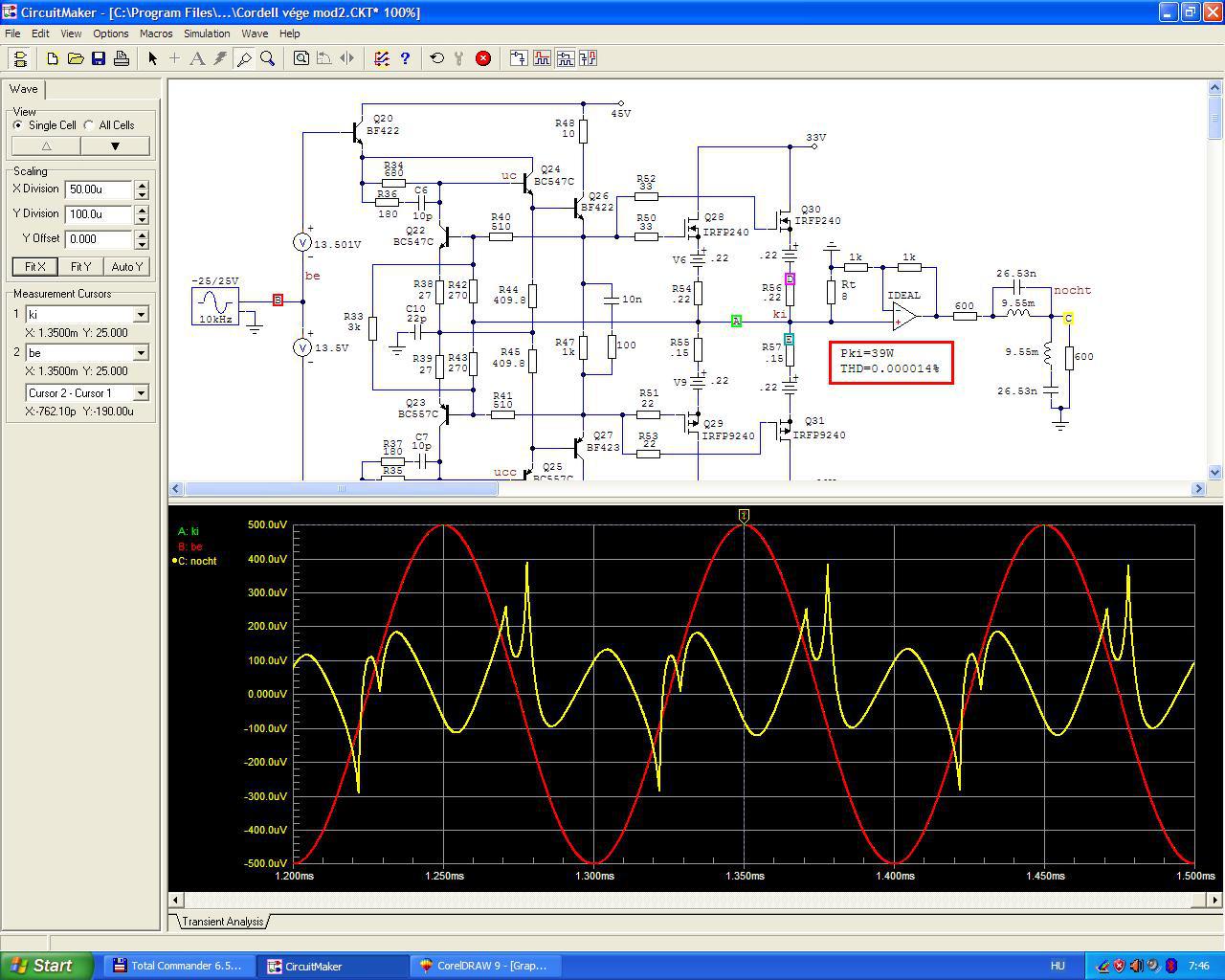 Nem véletlenül van az, hogy a Cordell erősítőben már 20 kHz-en nem is olyan kicsi a THD. Ezt egy VF2 is tudja. Én máshogy csinálnám meg, az egész erősítőre csinálnám meg a HEC-et. Karesz 50-nek pár éve küldtem szimulációt, akkor azt mondta, hogy neki ez az egész hibajavítósdi nem tetszik, mert pozitív visszacsatolású. Ha megtalálja a rajzot és téged érdekel, akkor kérd el tőle. Érdemes. Én már alapból nem értem a vitát, hogy ez miért lenne visszacsatolás? Amit mi visszacsatolásnak nevezünk, abban van alapharmónikus, akár pozitív, akár negatív a visszacsatolás. Ez a HEC inkább kompenzálás. ( Bár ez a dolog lehet, hogy csak engem zavar. ) 1 kHz-en egy optimalizált VF2 is tud -5-en szintű THD, de ott is 20 kHz-en van a probléma. Egy VF2 a HEC-cel lemegy-7-re is, de 20kHz-en ez már csak -4-en és ezt majdnem tudja a VF2 önmagában is. Tudná is, ha lenne rendesebb opamp, ami mondjuk nagyobb nyilthurkú erősítésű, mint pl. az LT1223.