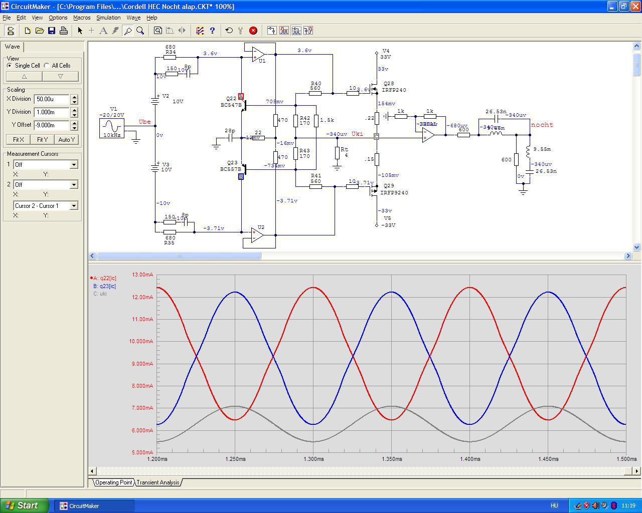Ami eddig lejött: Lehet pozitív, lehet negatív visszacsatolásnak tekinteni. Belemélyedve valóban így van, mert mintha úgy lenne finomhangolva, hogy ha a végfetek nem lennének görbe karakterisztikájúak, éppen semmit sem erősítenének pluszban. Ha az átviteli tényező csökken, akkor pozitív, ha növekszik, akkor negatív a visszacsatolás. Nekem is az fordult meg a fejemben hogy leredukálom a kapcsolást műveleti erősítő szintre, de nem jó. Éppen a lényeget nem mutatja a szimuláció. Kis időm lesz, neki futok még egyszer, mert most már jobban érdekel az egész. Ha jól gondolom, ennek a pozitív és negatív közti átmenetet dolgozó visszacsatolásnak az lehet az értelme, hogy ha a a végfet éppen nem torzít, akkor a visszacsatoló tranzisztor nem csinál semmit. Azaz, nem viszi be a saját torzítását. Na, jól belebonyolódtam. Meg is született a fejemben egy alternatíva. Otthon meg is nézem szimulátorban. Ha lesz valami hozadéka, felteszem ide a skiccet.