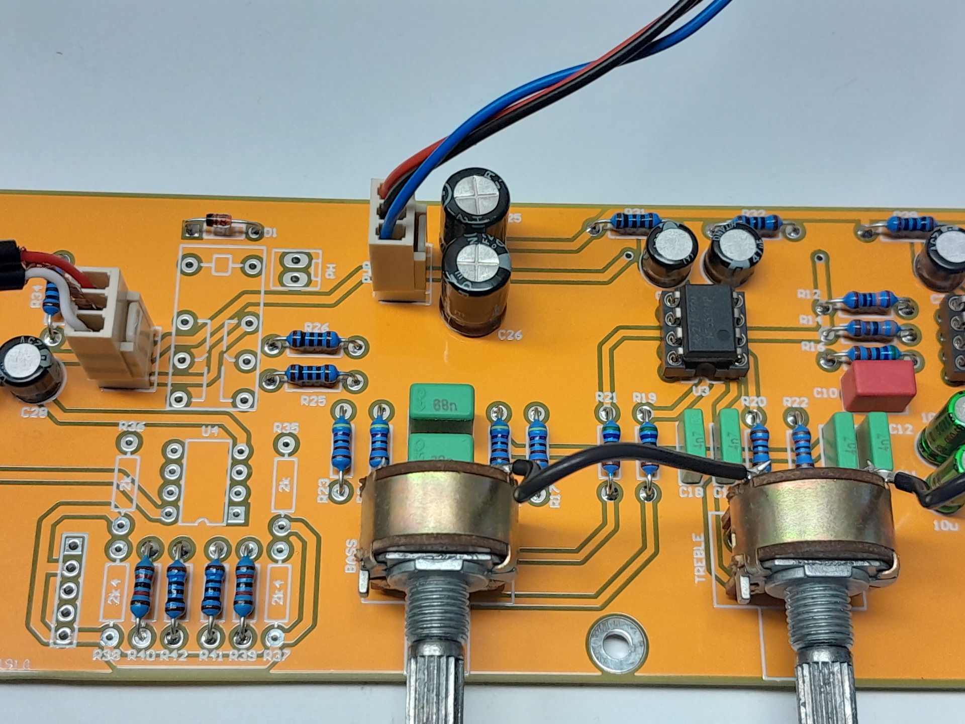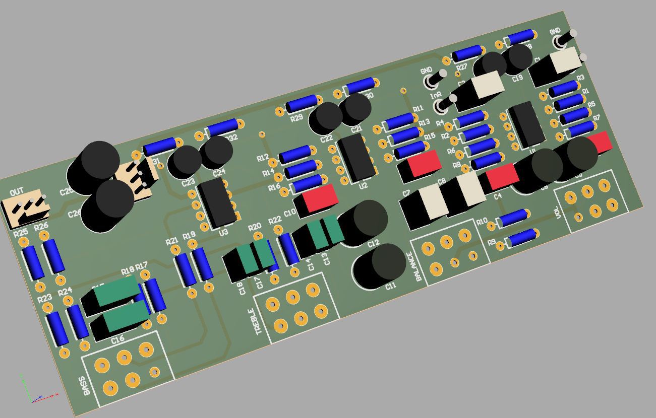 A linkelt NYÁK-képen a vezetősáv kialakítást vedd figyelembe! A magas és a mély potikat is pont fordítva kötötted. A csúszka C13, R17-hez essen kiemeléskor!