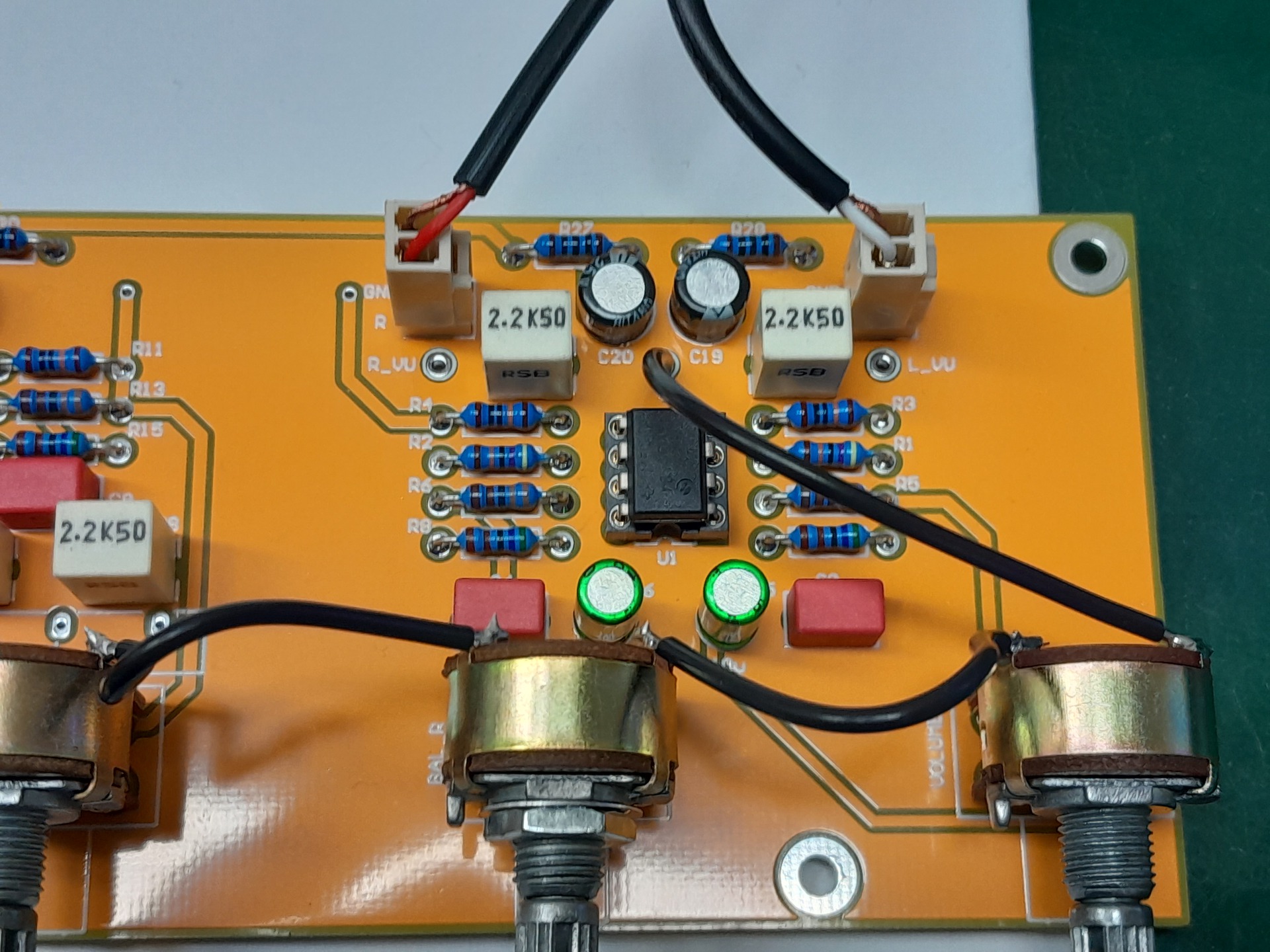 A C5-ön közel 200 mV esik, ami ugyan kinullázható, de ez újabb kihívást jelent. A lehetséges megoldások közül ez bizonyult optimálisnak. Vonali jelszintnél a potenciométer ellenállás-pályán már 20 mV DC is hallható sercegést okozhat.
