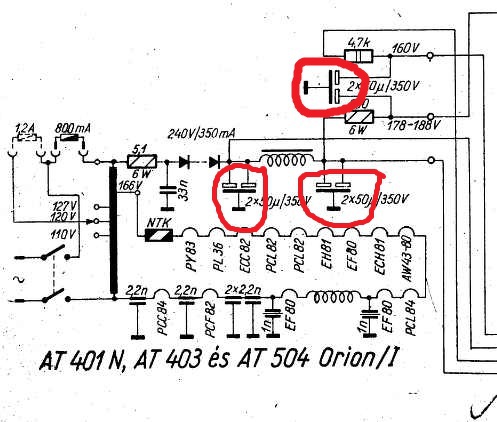 Amire a nyíl mutat és szikrázik, az egy elektrolit szűrőkondenzátor 50+50µF (dupla), a rajzon bekarikáztam, valamelyik a 3db közül. 2db 47µF 400V-os kondiból lehet rittyenteni mert ilyen kiszerelésben már nem árulják. A "zsinnyegést" feltehetőleg a képeltérítő fokozat okozza, mert az 50Hz dolgozik, bőven a hallható tartományban, és a végére van téve egy légréses kimenőtrafó (a hangvégfokozathoz hasonlóan) ami adhat hangot, és ami táplálja a függőleges eltérítőtekercset. A mellékelt kiollózott függ. fokozatot vizsgáld át. Nyilván egy szűretlen tápfeszültség, éppolyan brummot és zavarokat okoz mint bármely más fokozatban.Szükség esetén próbaképp megcserélhető a PCL82 a hangfokozat csövével, mert az is PCL82 ha jól látom. A soroszcillátor+sorvégfokozat jellemzően nem "zsinnyeg" és a 15625Hz(sorfrekvencia) fütyölését, már 50 felett nem is nagyon hallja meg az ember. Még annyit, ha a kondit matatod ki kell sütni, a kellemetlen élmények elkerülése végett!