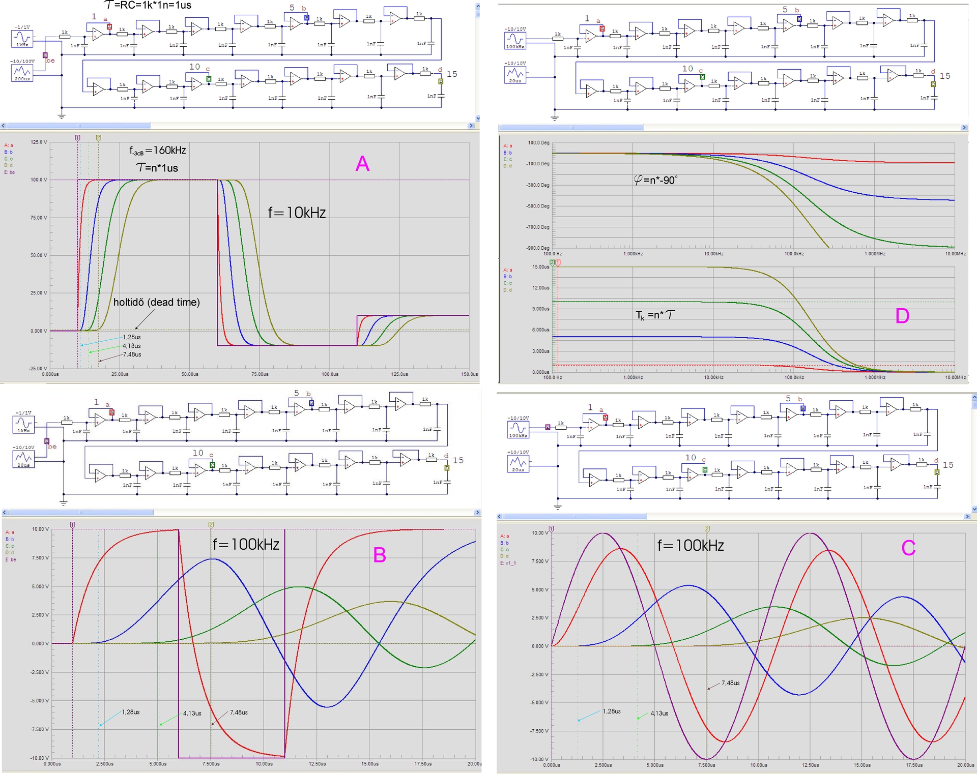 Egyébként is könnyen belátható, ha gyorsan szeretnénk ki-bekapcsolgatni egy végtranzisztort, vagy MOSFET-et, ehhez gyors és nagyáramú meghajtó fokozatra van szükség. Ha hibajavítást is alkalmazunk az áramkörben akkor minden aktív elemnek ami ebben részt vesz, még ennél is gyorsabbnak kell lennie. Itt nagyságrendileg több tíz MHz-ről beszélünk. Addig morfondíroztam ezen, mígnem akaratomon kívül ismét visszakanyarodtam a csoportfutási idő (röviden: futási idő) problémájához. Hogy mi is ezzel a "probléma"? Rengeteg vitát vált ki szakmai körökben az a kérdés, hogy a negatív fázistolás az most csak "sima" fázishiba, vagy késleltetés is? A legtöbb mérnök azt mondja, hogy a visszacsatolt rendszerben nem létezik az a fogalom amit a "dilettánsok" állítanak, hogy: - beadok egy impulzusjelet (vagy bármilyen perecalakú jelet) a bemenetre és ennek a jelnek időre van szüksége amíg a bemenettől eljut a kimenetig. Majd amikor felerősítve (nyílthurkúan) megjelent a kimeneten, fogja magát és a visszacsatoló hálózaton keresztül (időkését szenvedve) "keveredik" a bemeneti jellel... csakhogy a bemeneten ekkor már egy megváltozott jelalakkal találkozik. Emiatt aztán nem csökkenti a torzítást hanem növeli. Emiatt az elmélet miatt ragaszkodnak sokan a globális visszacsatolást nem tartalmazó erősítőkhöz. - a mérnökök meg azt mondják, hogy a fázistolás az nem késleltetés... mert a ki- és a bemeneti jel között állandó kapcsolat van. A visszacsatoló hurok felől érkező előtorzított jel kivonódik a bemeneti jelből és csökkenti a torzítást - akkor is ha a kimeneti jel nincs fázisban a bemeneti jellel. És ez nagyjából addig igaz míg a kimeneti jel fáziskésleltetése nem haladja meg jelentősen a - 90 fokot. Ezen gondolkodtam és már megint elkezdtem rajzolni. Pontosabban a szimulátor kezdett el rajzolni. Belerajzoltam egy csomó (15 db) azonos határfrekvenciájú (időállandójú) aluláteresztőt. Ezeket ideális műveleti erősítőkkel izoláltam, hogy ne legyenek hatással egymásra. A "compozit"-tól kapott szabályozástechnikai könyvet is fellapoztam, hogy tudományosabbnak hasson amit rajzolok. Ez pontosan definiálja a holtidő, a megindulási idő, a felfutási idő fogalmát. Mit látunk az "A"-val jelölt ábra, a tranziens analízis diagramján? - Az elsőrendű aluláteresztő szűrőnek még nincs késleltetése (holtideje). A másodrendűnek már van. A fokszám növelésével nő a holtidő. (Mondjuk ez senkit nem ért váratlanul... gondolom.) A holtidő független (a be- és) kimeneti jel amplitúdójától. - A "D" ábra is tanulságos néhány szempontból. Egy bármilyen felépítésű/rendszerű erősítő fokszámát könnyen megállapíthatjuk a Bode diagram fázis ábrájából (ha megfelelően magas frekvenciáig vizsgáljuk, mondjuk 1 GHz-ig). Ha a teljes fáziskésleltetés mondjuk -450 fok, akkor az erősítő öt pólust tartalmaz. Azért nem írom, hogy öt fokozatú mert egy kétfokozatú erősítőnek is lehet 5, vagy akár több töréspontja a passzív (RC/LC) tagok miatt. Arról megint egy fél könyvet lehetne írni mit is mutat a Group Delay (futási idő) diagramja. A holtidőt nem mutatja. Annak komoly matematikai háttere van amit nem értek és (saj nos) nem is érdekel. Az RC szorzatot mutatja (ami itt most 1us). Ez a törésponti frekvencia alatti késleltetési idő. A fázisban eltolt kimeneti jel - a nullátmenetnél és állandósult állapotban - ennyit késik a bemeneti jelhez képest. Az állandósult állapot nagyon fontos feltétel! A törésponti frekvencia felett a késleltetés csökken. Végtelen frekvencián nulla lesz. Hogy miért lesz nulla ezt könnyű belátni. Az 1 MHz-es szinusz Pí/2 periódusideje 250ns, a 100MHz-esé 2.5ns... és így tovább. - A "B" és a "C" analízis megint nagyon érdekes. Ha négyszögjelet átengedjük egy elsőrendű aluláteresztő szűrőn, jóval a törésponti frekvencia felett (kb. 1 dekáddal fölötte) háromszögjel jelenik meg a kimeneten. A másodrendű kimenetén szinusz. A szűrők fokszáma ezután már bármennyi lehet, a kimeneten mindig szinuszt fogunk látni. Ha két diagramot összehasonlítjuk, a "sokadrendű" szűrő kimeneti jeléből már nem tudjuk megállapítani, hogy a bemenetre szinuszt, vagy négyszöget kapcsoltunk. Sem a jelalakban, sem a késleltetésben nincs különbség... csak amplitúdóban, de ez sem (különösebben) jelentős. Kicsit hosszúra nyúlt ez az izé, de azért még nézzük meg mindezek után a "késleltetés" szimulációt. - Az "A" analízisen azt látjuk, hogy (természetesen) a szinuszjelnek is van holtideje a "sokadrendű" szűrő kimenetén. - A "B" szimuláció egy nagy kérdőjel. El lehet rajta gondolkodni. Az elsőrendű szűrő kimenetén ugyanazt a lassú megindulást látjuk, mint a tizedfokún. Csak persze ez a "lassú", rövidebb idejű. De ott van. Újra megkérdezem a nálam okosabbaktól: most akkor a fázistolás vajon késleltetés-e... vagy csak annak látszik? - A"C" csak úgy elrettentésképpen. Ha a 160 kHz-es töréspontú 15-öd rendű szűrő bemenetére 160 kHz-es Burts-öt kapcsolunk... semmi köze a kimenti jelnek a bemenetihez. Tehát a speed a király, ahogy Cordell mondta. Én meg kissé bő lére eresztve, de kitárgyaltam (és még így is félig-meddig kutyafuttában) ezt a tőmondatot.