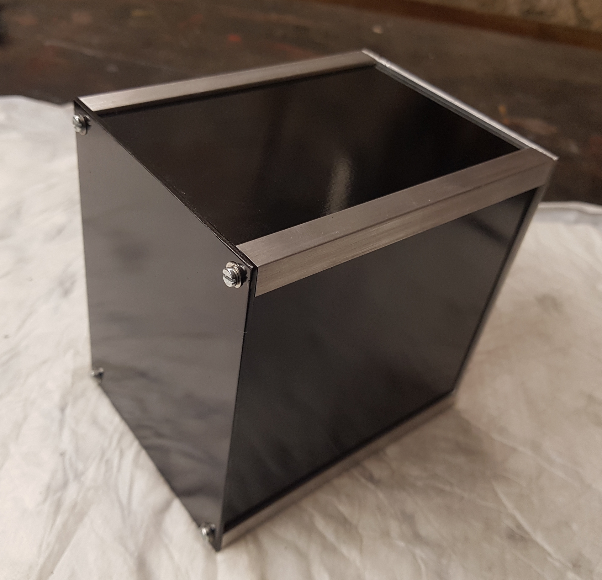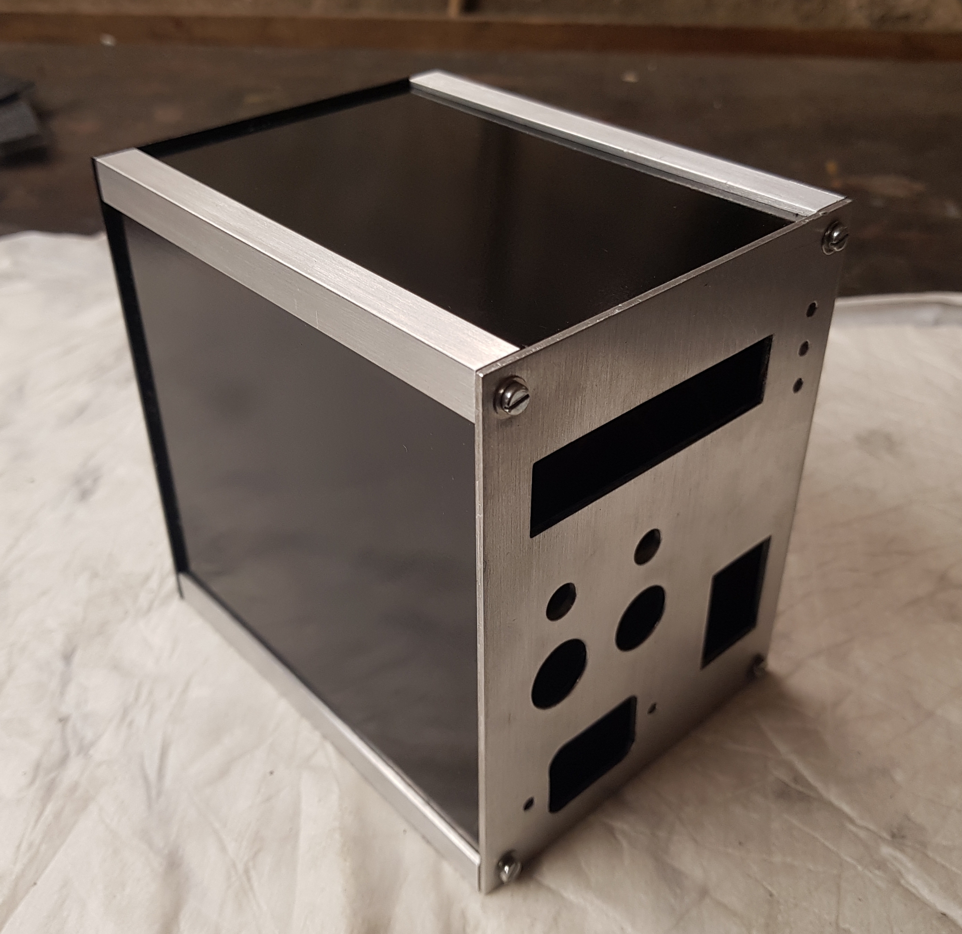 Kritizálható állapotig jutott a dobozkonstrukcióm. A terveket követve, megcsináltam az egyetlen belső tartólemezt, és ezt, illetve a borítólemezeket óvatosan befestettem feketére. Ettől nem várok sokat, mert részben nem erősségem a festés, másik részben az alumíniumra nem tapad úgy a f esték mint pl. vaslemezhez, könnyen sérül, és leválik. Tanácsolták, hogy sütőben melegítsem meg egy kicsit, mert az jelentősen fokozza a tapadást (ez még nem történt meg).