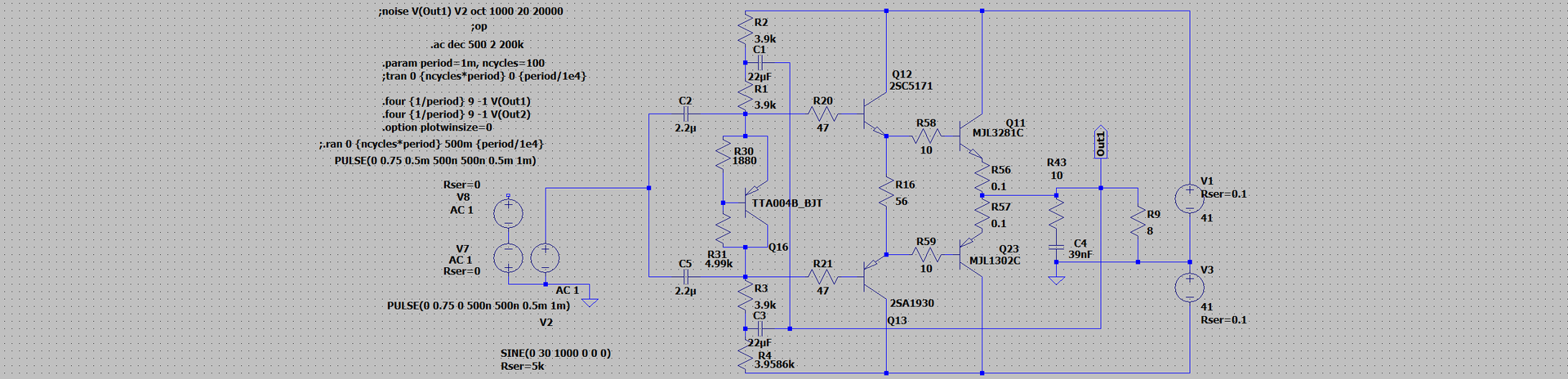 Ezt gyorsan összedobtam. Kéne még, hogy pontosan milyen lesz a meghajtás. R4 és R30 trimmerek. Előbbivel a kimeneti offszet, utóbbival a nyugalmi áram állítható.