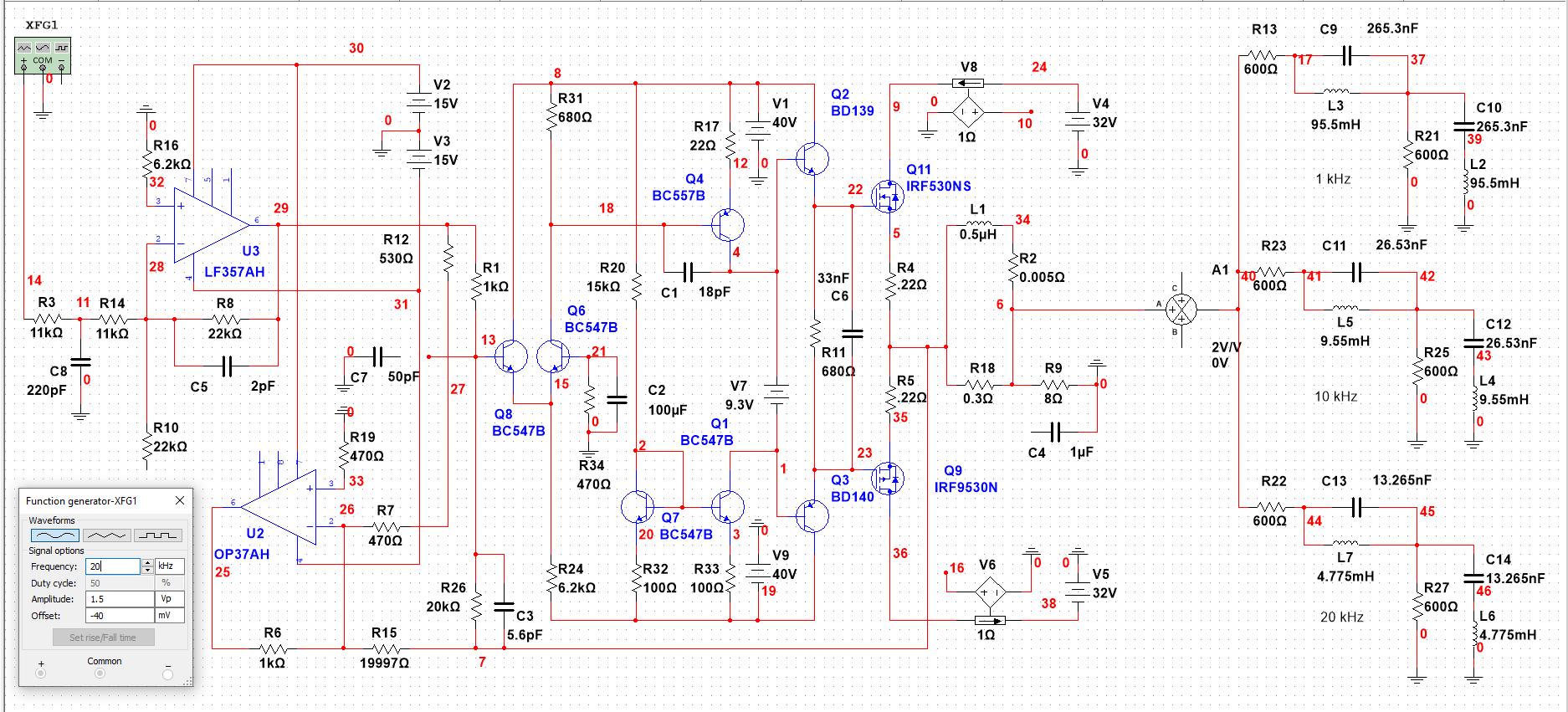 Fogtam egy nagyon egyszerű végfokot, ami bár jól működik, de azért ez csak egy szokványos elrendezés. A hibajavítást az elejére építettem, két opamp felhasználásával. Az alsó, U2 a bemeneti jelből kivonja a kimeneti jelet, tehát ez képezi a kompenzáló jelet, vagy hibajelet, kinek hogy tetszik. A felső, U3-as ezt a jelet adja hozzá ( megfelelő fázisban ) a bemeneti jelhez. Ezzel már kész is. A végfok a 13-as ponttól kezdődik, de miután ott van a generátor és a 13-as pont között egy opamp egységnyi erősítéssel, tekinthetjük úgy, hogy a tényleges bemenet a generátornál van. Az R10-es ellenállás valamelyik lábát felemelve csak a végfok paraméterei láthatók, HEC nélkül a következő szimulációkon. A kapcsolási rajz nagyon egyszerű, én betettem egy pici fojtót a kimenetre, ez nagyon stabillá teszi az egészet, nincs gerjedési hajlam. Ezt a fojtót illik megcsinálni litzéből, jó nagy keresztmetszettel, mert ennek az ohmos ellenállása beleszól az egész erősítő belső ellenállásába. Remélem megvalósítható 5 mOhmból. Az 1 µF-dal terhelt kimenetet arról lehet megismerni, hogy a FET-ek drain áramában bekapcsoláskor ott van egy 30A körüli tüske. A kondit fel kell tölteni... szóval ez megy szimulátorban, de a valóságban nagyon gyorsan kilukadnak a tranyók. A tranziens vizsgálatoknál a kimeneti feszültség teljes kivezérlésnél van ábrázolva, a fellépő drain áramokkal együtt. A fázistartalék bőven 90 fok kondi nélkül, de kondival is csak minimálisan van 90 fok alatt, mert van egy pici kiemelése kondival. A torzítások nem is olyan rosszak, ahhoz képest, hogy csak 94 dB az előremenő ág erősítése. Mivel 20-as a komplett feszültségerősítés, a hurokerősítés 94-26= 68dB, hát, ez nem sok... Holnap folytatom. A hozzászólás módosítva: Okt 1, 2023