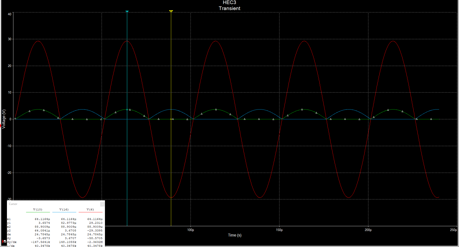 Van egy puritán AB osztályú erősítő ami 10kHz-en kb 0,05% torzítást produkál. Ennek fő komponense a mosfetek lezárásakor keletkező tüskék. Nos én egy aluláteresztővel levágom a nagyon gyors éleket, majd a maradék jelet összehasonlítom az eredeti bemenő jellel. Kapok egy hibajelet, ami bőven 1V alatti. Ezt egy alacsony tápról üzemelő "A" osztályú erősítővel vezetem a terhelés GND pontjának helyére. Nem nagy eredmény, de talán gondolatébresztőnek elég. A zöld vonal a bemenő jel ezred része, a sárga vonal a fő erősítő Karesz lyukszűrő utáni maradék feszültség, a kék vonal pedig az ellenfázisú zavarjel kioltó utáni maradék.