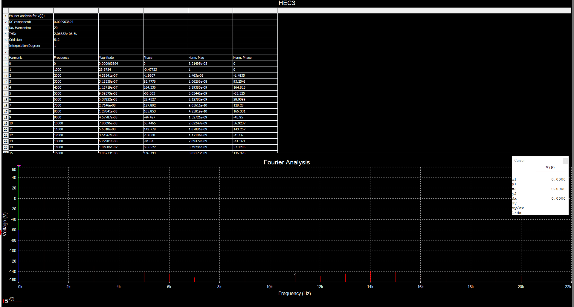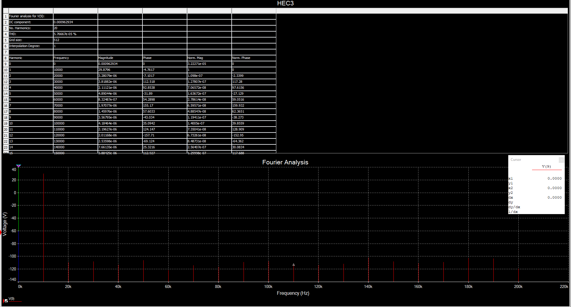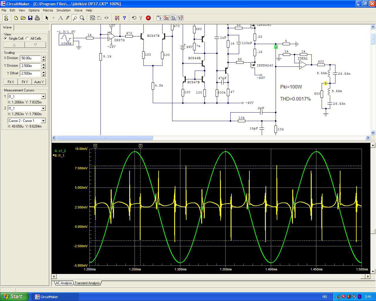 A tegnapi rajzon a frekvenciakompenzálást nem a 13-as pontra, hanem a 27-esre kell kötni, de nincs rá szükség. Ahogy észrevettem, a fő probléma, hogy ha a kompenzálójelet beállítom, hogy mondjuk 1 kHz-en minimális legyen az alapharmónikus tartalma, akkor 20kHz-en már ez tetemes érték lesz. ( 2...3 mV ) Nem is annyira a fázistolástól van, hanem attól, hogy a frekvenciamenet nem száz százalékban egyenes. és már nagyon kicsi esés elég ahhoz, hogy megjelenjen az alapharmónikus. Ami nagyon érdekes, hogy nem sok jelentősége van, tehát nem kell annyira pontosra beállítani, meg frekiben kompenzálni sem kell, csak elrontjuk vele a kompenzálójelet. A szimulátor eredményei teljes kivezérlésnél: 20kHz-en, 1,5 V bemeneti feszültségnél 0,00015 % 10kHz-en ez 5,76e-5 % 1kHz-en 2,06e-6 % Az offset a kimeneten ezzel az LF357-tel 32 mV, ezért kellett a generátorba beállítani 9 mV-ot. Szerintem, az ic modellje rossz a Multisimben, máshol is ezt csinálja. A Karesz 50-től átvett szűrők kimenetén ( a kapcsolási rajz jobb oldala ) a feszültségek csúcstól-csúcsig: 20kHz-en 2,6mV 10kHz-en 1mV 1kHz-en 60uV Ezek a tüskék 1 us-on belül vannak. Nehezen képzelem el, hogy ez hallható lenne. 1 kHz-en alig látszanak tüskék, inkább csak a THD 3. felharmómikusa dominál. Az IMD spectrum is látható 19 és 20 kHz-es jelekkel, szintén teljes kivezérlésnél. Az elrendezés tisztán kapacitív terhelésre sem gerjed be, szépen látható, hogy a draináramok 90 fokot sietnek a kimeneti feszültséghez képest. Egy picit csökken a fázistartalék, de alig van túllendülése a négyszögjeles meghajtásnak. 4 ohmos terhelésre is jó, csak akkor már kevés a tápfesz és nagy az Rdson, csökkenteni kell a 0,22 ohmokat, 0,1 ohm is elég egy esetleges áramkorláthoz. Vagy nagyobb tranyó kell bele. Ennél jobb eredményeket a javítandó végfok elrendezésében lehet keresni, elsősorban a nagyobb sávszélesség javítana a helyzeten. Ettől még a bemeneten vissza lehet butítani. Más kérdés, hogy minek? 20 kHz-en? Az opampok nagyobb sebességűre való kicserélése nem sokat javít. Sajnos, a Multisimnek van egy rossz tulajdonsága, néha gondol egyet és átszámozza a vezetékeket. Ezért a mai eredményekhez tettem fel új kapcsolási rajzot. A többi kép holnap, mert nem enged többet a HE. Karesz50: már irreverzibilissé tetted a folyamatot. A hozzászólás módosítva: Okt 2, 2023