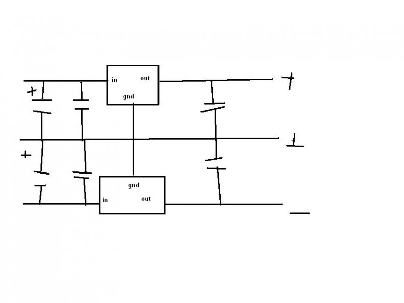 Úú! Még valami, amit el is felejtettem. Ha megvan a stabilizáló IC másik "párja" azaz a negatív feszültséget előállító akkor lehet így kötni őket? (gyors paintos rajz