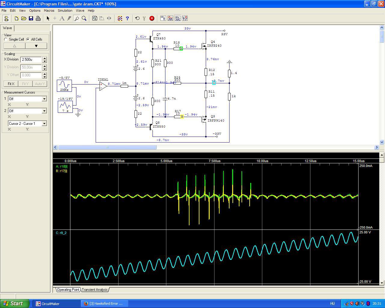 "Mellesleg". Továbbra is hídban gondolkodom, ezért szimulálom olyan kis terhelő ellenállásokkal. Hídban elég a szimpla táp (1*66 V). Sokkal kisebb zavarjel keletkezik a tápvezetékekben, mert mindig azonos a két tápsín árama. Szorosan egymás mellett vezetve őket, csökken az induktivitásuk és a szórás. Félhídban is kellene ekkora kimeneti teljesítményhez legalább négy pár végfet, de így csak kettőt kell meghajtani. Persze ennek is van hátránya: a nagyobb veszteség, a kisebb kivezérelhetőség... (5V Uds alatt már hatalmas a Ciss). 'Dehát' semmit nem adnak ingyen.