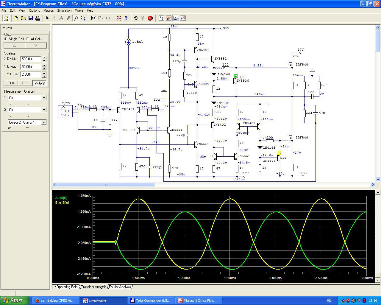 Meg kellene nézni a valóságban, mert most bent hagyott tranyókkal kisebb a THD, 0,0004% eddig meg mindig nagyobb volt, 0,0018 körül mint nálad is. Épp milyen kedve van.
