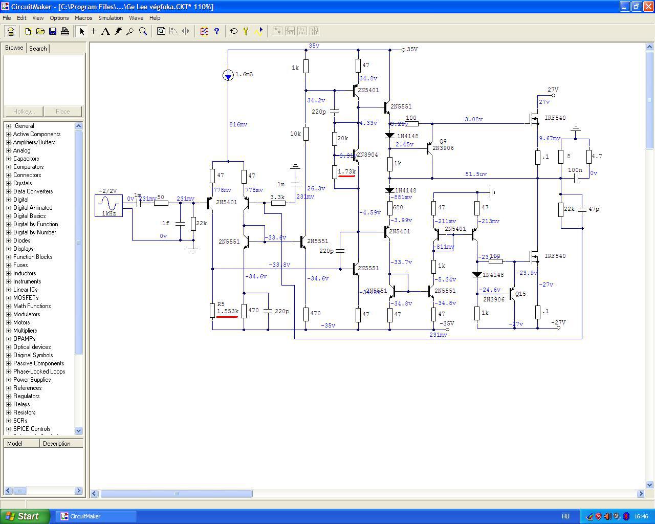 Jó néhány végfokot építettem IRFP-vel a szimulátor eredményeire támaszkodva és mindegyik hozta azokat az eredményeket amiket a CM mutatott. Persze a "szokásos" szórást le kell vonni, hogy nagyobb a THD, meg a szórt kapacitások, fólia induktivitások... stb. De nem volt rosszabb a szimuláció eredménye, mint egy BJT-s előerősítőnél, például. A pontos Ugs nyitófeszültség miatt esetleg érdemes berajzolni azt a 0.22 V-os battériát a source-el sorosan.