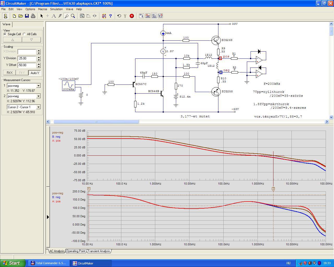 Kipróbáltam egy ellenütemű komplementer végfokkal is, hogy tényleg van-e valami gyakorlati haszna (szimulátorban) ennek a két félhullámra bontásnak. A HTA30 - a világ egyik legegyszerűbb kapcsolása - némi átalakítás után nagyon jól betölti az "üvegló" szerepét. Az eredeti kompenzáló hálózatot nem piszkáltam el, csak DC csatolásúvá alakítottam, hogy ne zavarjanak be a csatolókondik az átvitelbe.