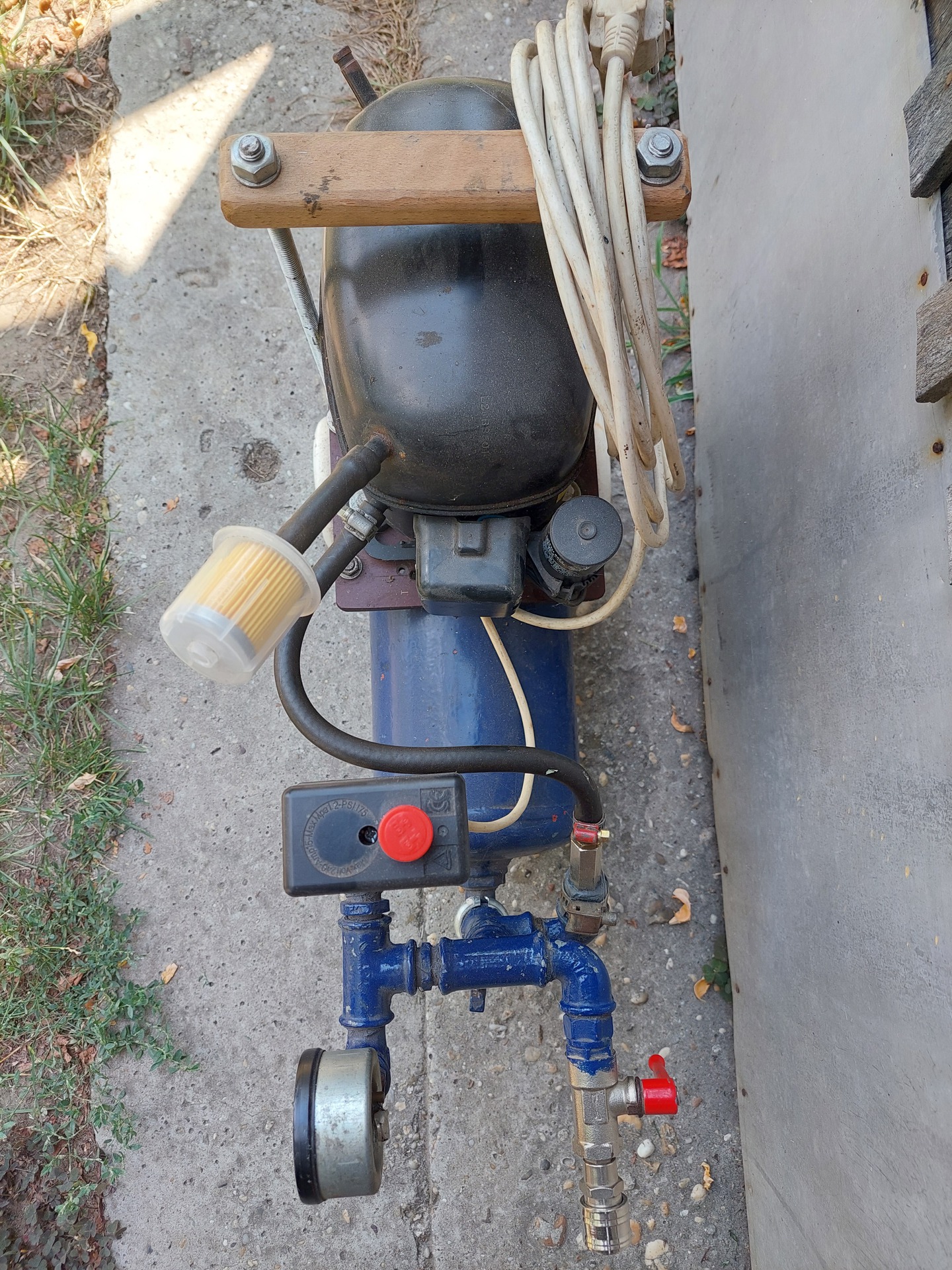 Készítettem egyet én is. A kompresszor egy kéthengeres, mindössze 32 köbcentis, meghajtása egy Tatramat mosógépből származó motorral, kb. 1:2,5 áttétellel. A tartály egy ZIL 20 literes tartálya, Kb. 15 perc alatt tölti fel 0 Bar-ról 8 Bar-ra. Egyszerű fújatási feladatokra tökéletesen bevált.