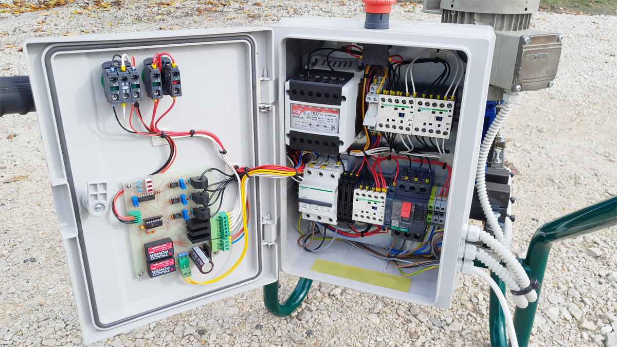 Nincs túlbonyolítva, ennyi a minimum. Ha az irányváltó kapcsoló nincs középállásban (üresben), nem indul el, hiába kapcsolom be a vezérlést. Ez a második védvonal véletlen indítás ellen, lévén igen nagy szája van, szabadon. Minden vezérlés 24 V-os, a vészkapcsolókhoz is csak ennyi megy ki. Ha megakadás esetén az elektronika nem működne, a hőkioldó lép a képbe, ez is tesztelve volt.