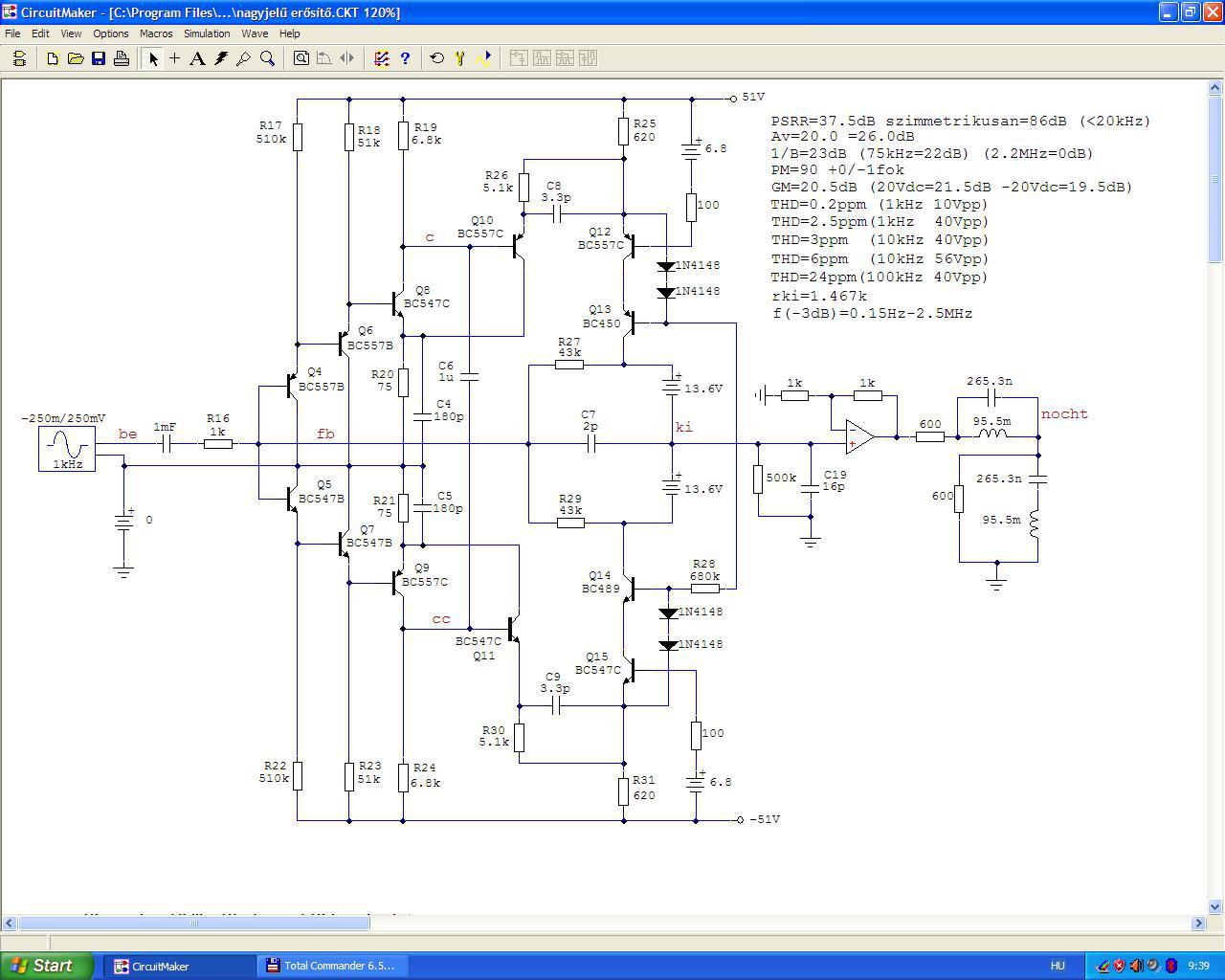Az R15, R20 által kevésbé fog függeni a nyugalmi áram, ha változik a tápfeszültség, hiszen ezeken keresztül huzogatja a bázisok potenciálját. Itt, ha jól emlékszem nem teljesen jól van beállítva, lehet jobb is. Miután a földelt bázisúak szinteltolók, de ugye nem arról van szó, hogy a teljes 40 V-nyi amplitudót kell biztosítani, hanem csak néhány voltot a tápsinek közelében. Ebből meg az jön, hogy túl sok DC feszültség marad a tranyókon, de áram az van ( a nyugalmi áram miatt ) ami felesleges és jó nagy disszipációt eredményez. Ezek a soros ellenállások ennek a disszipációnak egy részét veszik magukra. Néha esetleg lehet gerjedés, ezért kellenek a 33...220pF-os kondik. Az eredeti kapcsolásban a földelt bázisúak bázisa a 12V-on van. Ezzel csak az a baj, hogy 14...18Vp-p kimeneti jelet kell adnia az opampnak. Ez már slew-rate problémákat okoz. Ezért lett kisebb feszültségre állítva a földelt bázisúak bázisa. Én nem hiszem, hogy a tápsinen lennének tüskék. D osztályban biztos, de itt mitől? " De itt szinte egy az egyben kijutnak a kimenetre... és egyéb gondokat is okoznak." Egy-az egyben? Még 10 kHz-en is 66dB a tápelnyomás... egyébként, ez HEC-hez készült és az kijavítja , kivéve a tüskéket, mert ha azt is ki tudná javítani akkor keresztezési torzítás se lenne.