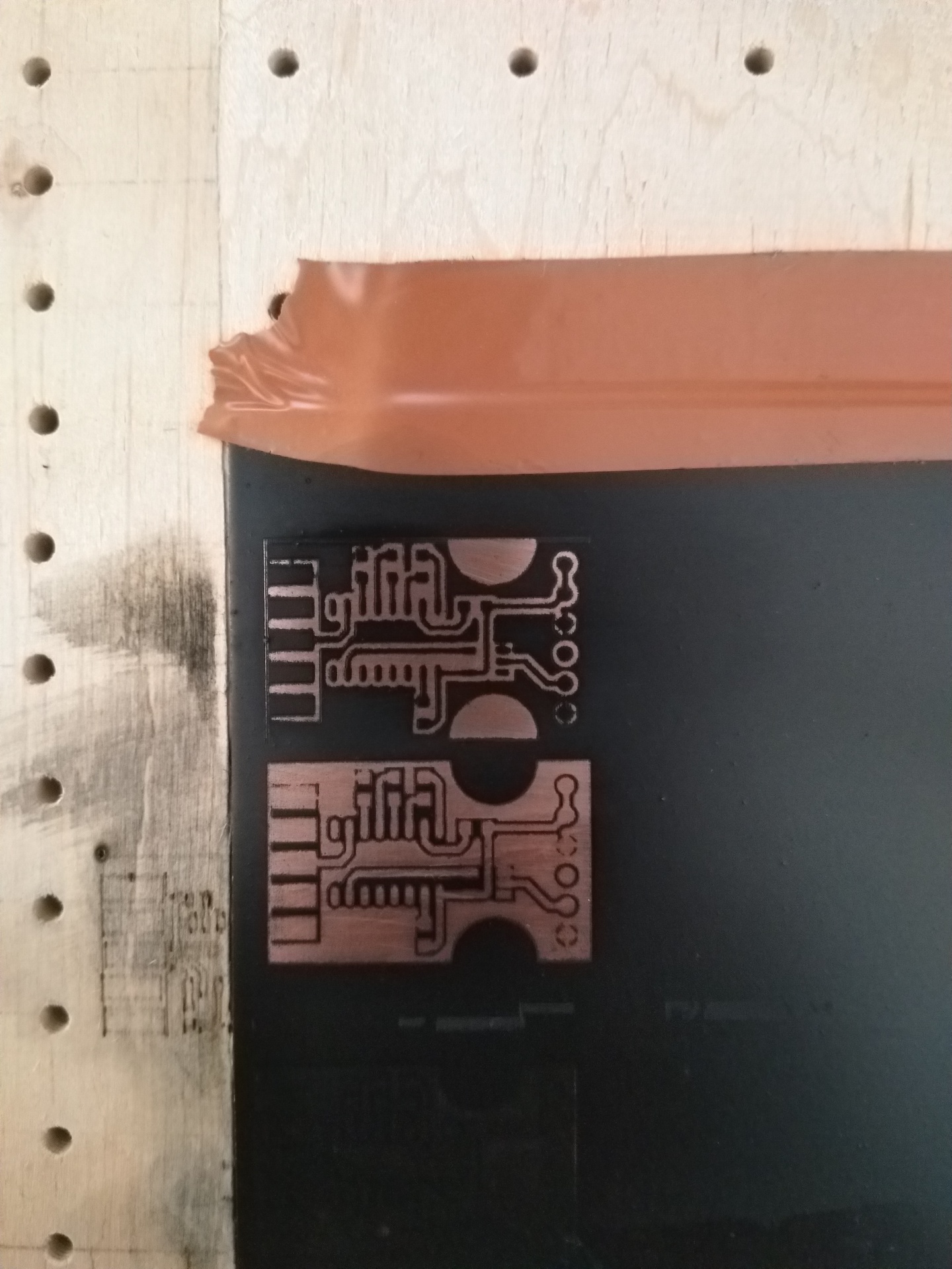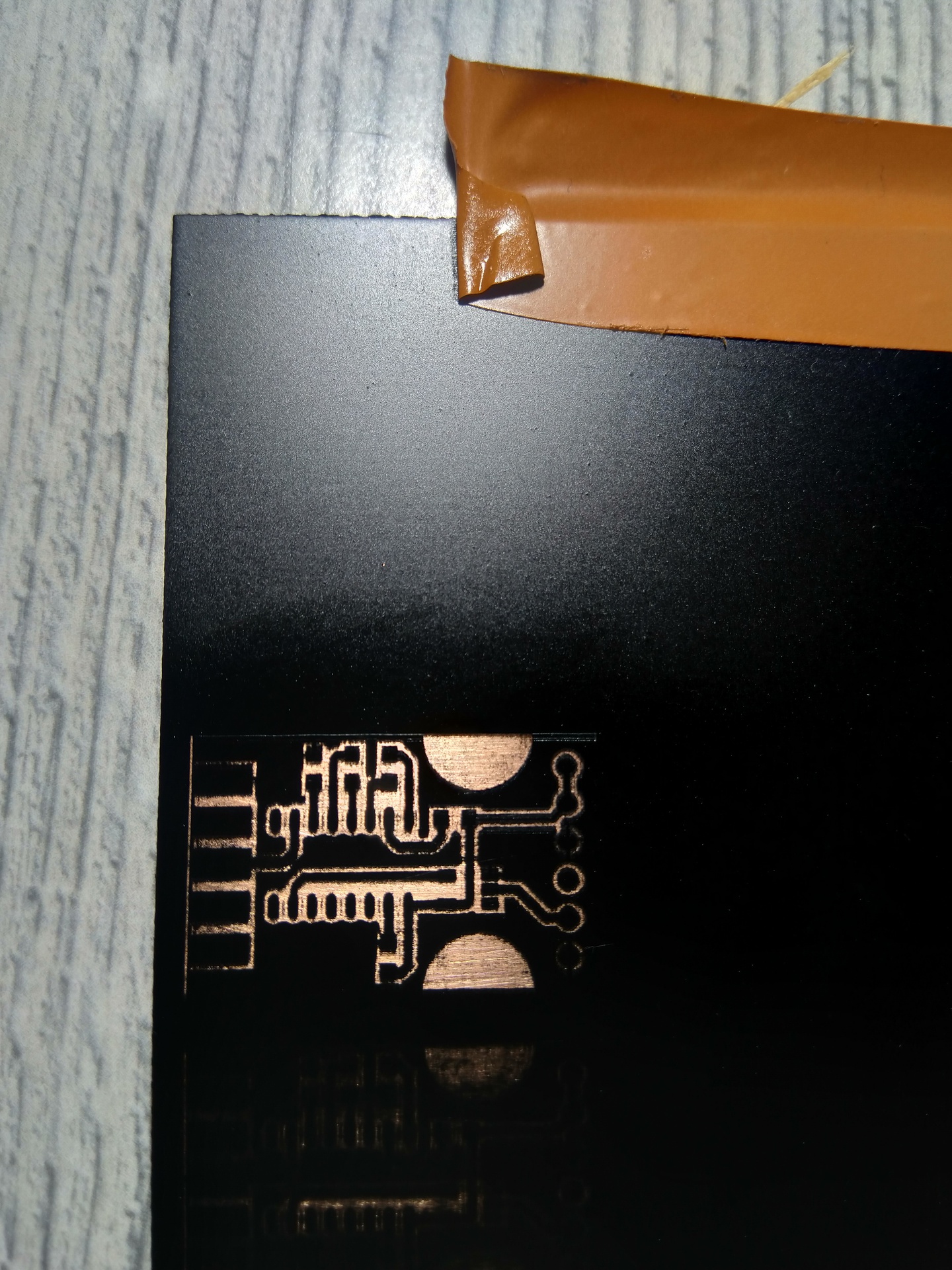 Ok, most megvan minden beállítás, jöhet az éles égetés. Beteszed alá a panel, végigégeted. Kiveszed és azt fogod látni, hogy a réz nem tiszta, marad rajta egy kis "kosz". Fogj egy kis alkoholt és töröld át vele a panelt, az lehozza a "kormot" és mehet a maratóba. Ha nem jön le mindenhonnan, ha szürke marad a réz, akkor vonalak maradtak, kicsi az erő vagy nagy a DPI, ha túl sok jön le, akkor túl kicsi a DPI beállítás.