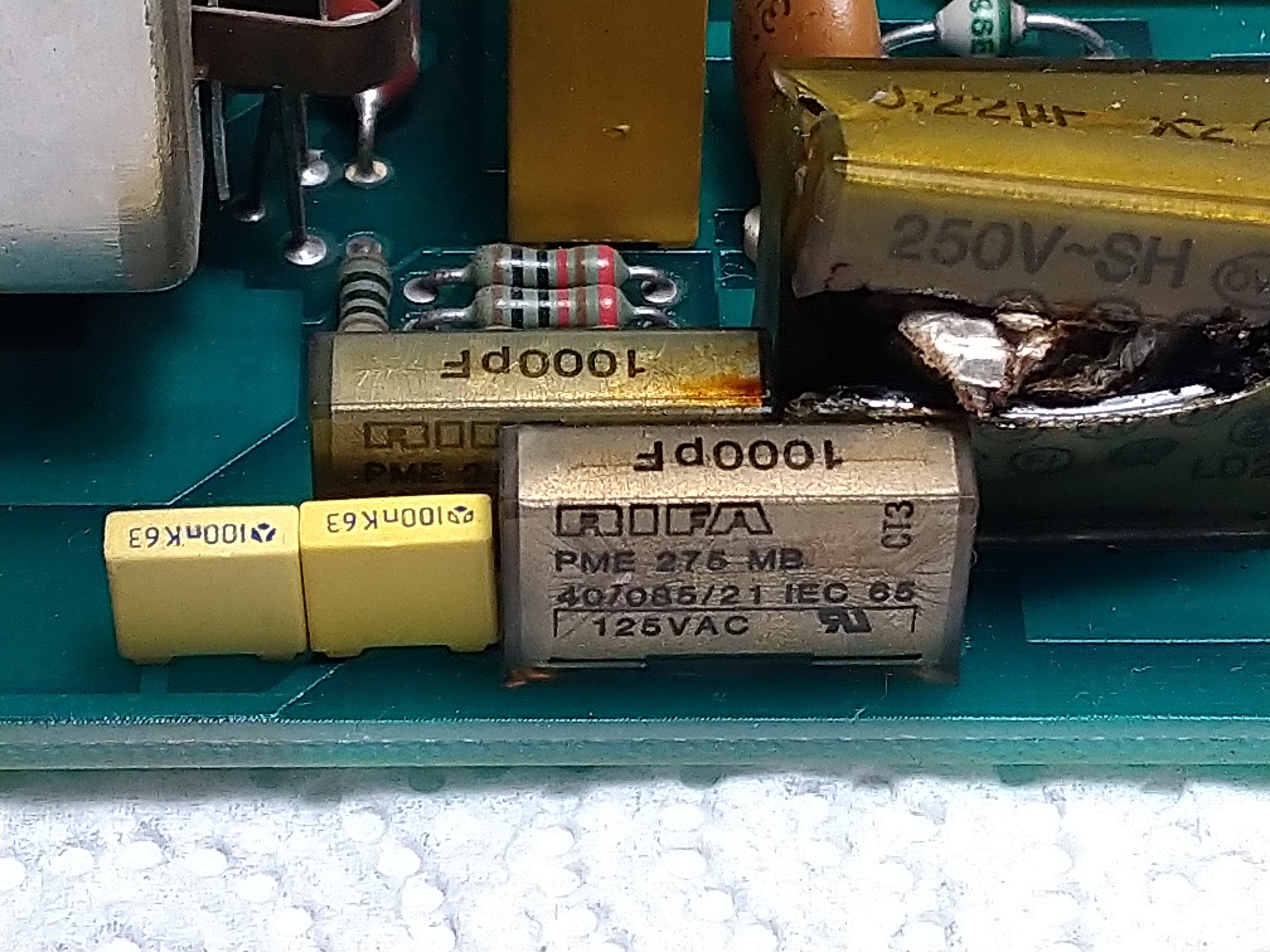 Egy 35 éves Philips PM3050 kapcsolóüzemű tápja van az asztalomon. A fő hibája egy (Tepee által előre megjósolt) 220nF X2 kondi, ezt könnyű lesz cserélni. Van még mellette 2db 1nF Rifa, hasonlóan műgyantás kondi, több helyen olvastam, hogy ezeket is érdemes cserélni. Jól sejtem, hogy ide Y kondikat kell venni? (C6002 és C6006 a rajzon.) Ezek 125VAC-ek és a velük sorba kötött 100nF 63V kondikkal alkotnak kapacitív osztót. Hogyan volt ide elegendő a 125VAC? |