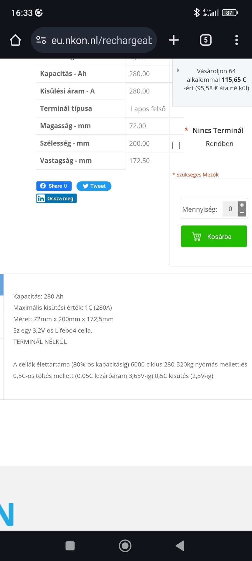 ebben azt mondja a készítője, hogy kb. az első 10 töltés-kisütés idején van esetleg értelme, hogy a gyártás során benne maradt buborékok eltávozzanak (ha a gyártó nem csinálta ezt meg a gyártáskor). Azt mondja, hogy utána semmi értelme, mert a duzzadást úgysem tudod semmilyen nyomással megakadályozni, és az öregedés miatti kapacitásvesztés nagyobb, mint amennyi a használat elején a nyomás hiányából adódna. Néztem magyar forgalmazókat, sehol nem írják, hogy összeszorítva kellene használni. A forgalmazók árulnak a cellákhoz összekötő lemezeket, töltőket, balanszereket, BMS-eket, de összeszorító szerelvényeket meg nem... Nem csak ekkora LiFePo cellákat árulnak, hanem sokkal kisebbeket is (góliát elem méretűeket is), azokat nem kell szorítani? Értelmetlennek tűnik ez a szorítás számomra...