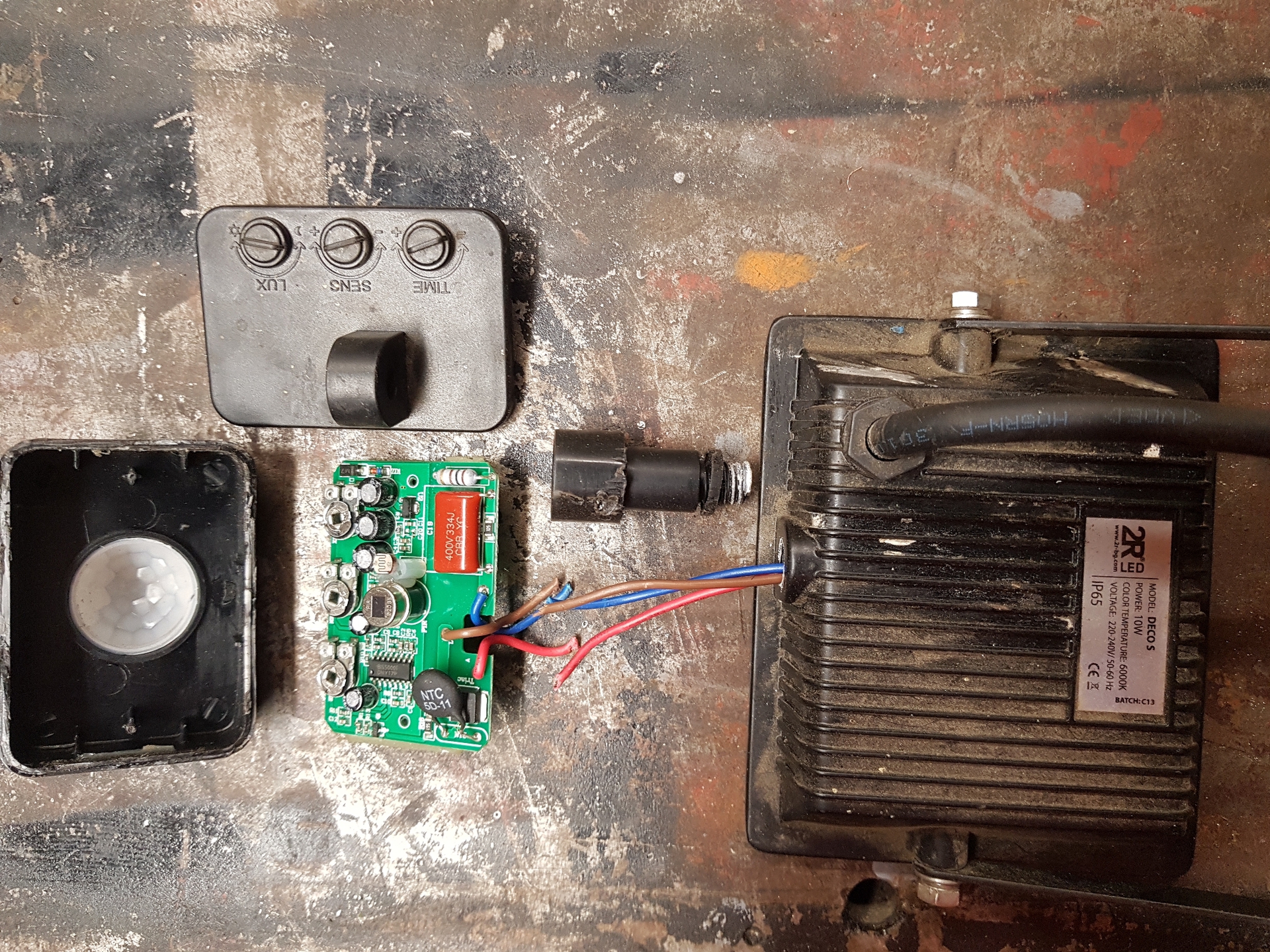 A feltárt bekötési mód teljesen logikus. Most már ismerve a belsejét, némi barkácsolással ezzel is el lehet érni a nálad megvalósított célt, de inkább vennék külön mozgásérzékelőt és külön világító testeket (főleg az IP védettség sértetlensége miatt).