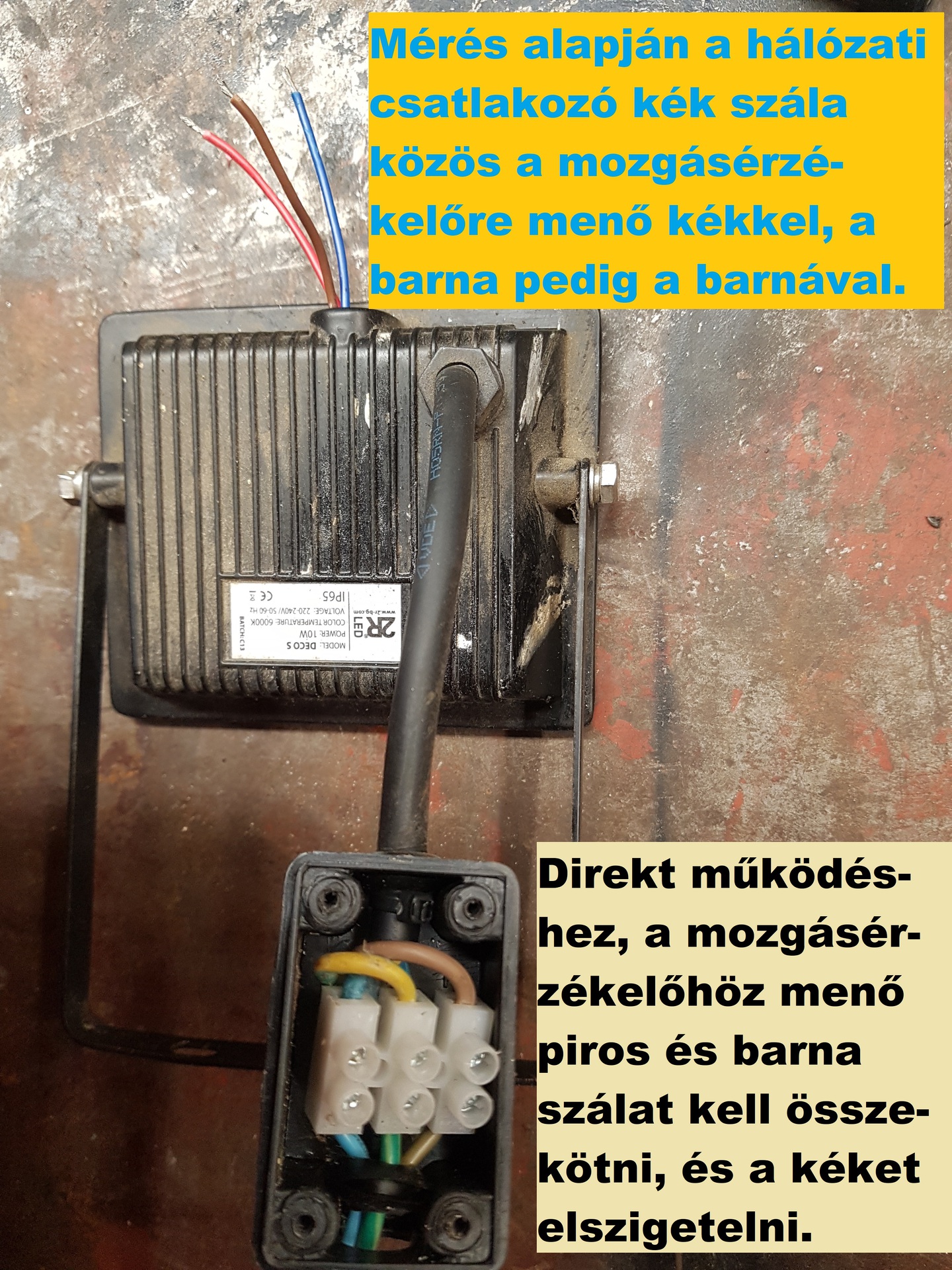Hali! Nekem szerencsésebb lámpám van A lámpa hátulján van egy kis kötődoboz ebben van a lámpa és az érzékelö is összekötve. Az enyém relés, kisakkoztam hogy fázist kapcsoljon a relé, ezétán ugyanide bekötötttem pluszban a mezei udvari világításkapcsolót is. Igy alaphelyzetben megy a mozgásérzékelőről, ha meg fix/hosszabb idő kell akkor kézzel felkapcsolom. Illetve a kapcsolt szálat még átvittem az udvar hátsó részébe is, azt is felkapcsolja.
