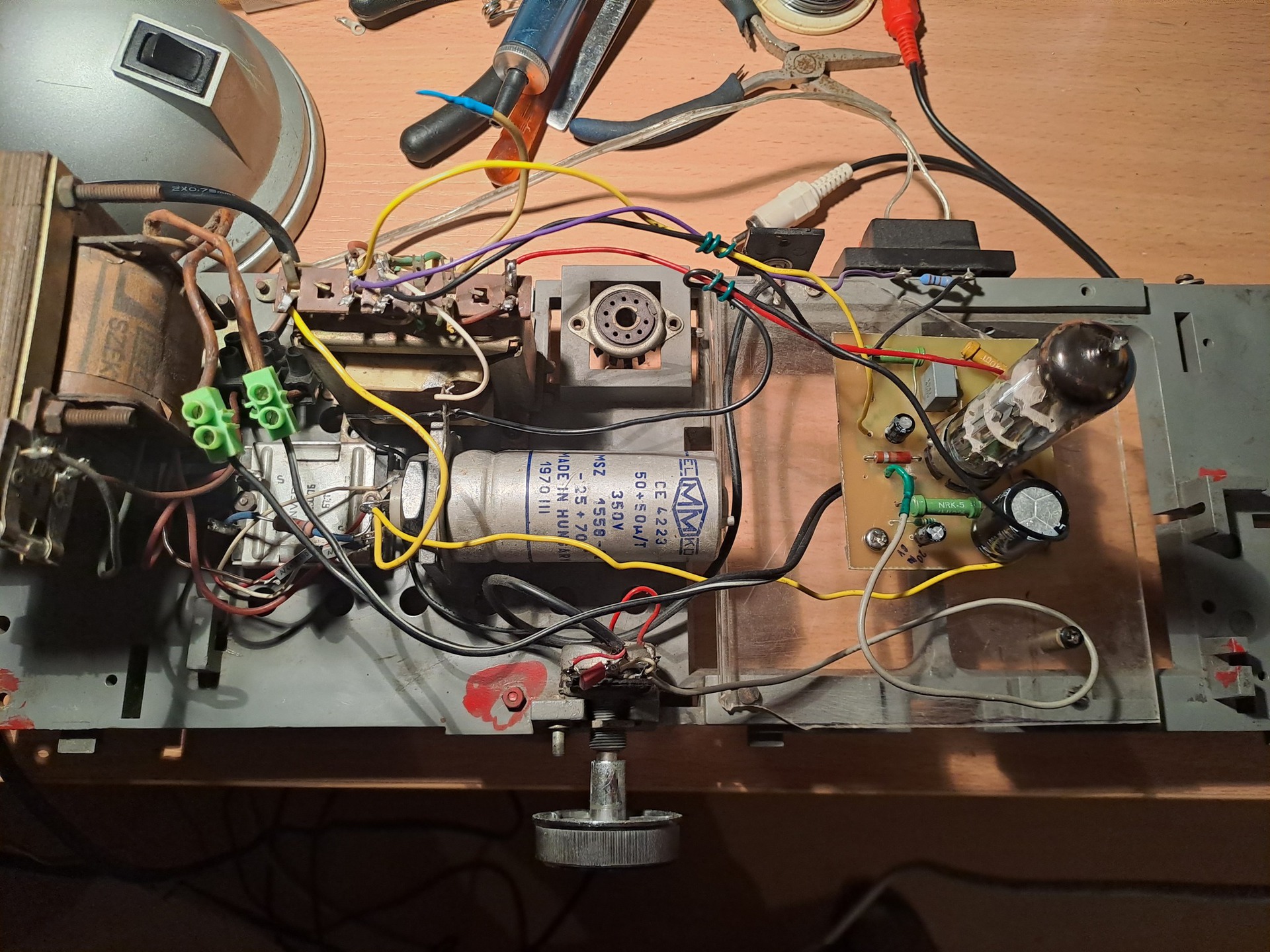 Egy jó 10 évvel ezelőtt - már fene se tudja, milyen részeredménnyel - félrerakott csöves panelt próbálok meg feléleszteni végre. "Klasszikus kezdőprojekt", egy SE-kapcsolás ECL86-tal, házilag maratott nyáklapra. Tulajdonképp ebben a formájában csak teszt a célom vele, és ha van egy működőképes konfiguráció, akkor majd betervezem rendesen, gépen, két csatornás - egy panelos kivitelre. Kapcsolási rajzát csatolom, ezt a panellal elrakott papírról rajzoltam be, emlékeim szerint egy Grundig orsós magnó végfokozatát másoltam le anno, tehát ez ebben a formában egy sorozatgyártott, működő kapcsolás kéne legyen. Na most a szerkezet elindítható, meg is szólal, de nem igazán tudja azt, amit kéne hoznia. Pici hangerőn egész tűrhetően megszólal, valamivel feljebb már érezhetően torz a mélytartománya, aztán egy bizonyos hangerőpoti-állás (nem hangerősség!) felett elkezd recsegni a dinamikai csúcsoknál. (Tudom, hogy eleve csak kb. 3W-ot lehet tőle várni, de azt is ismerem, hogy egy azonos teljesítményű-végcsövű rádióra ilyesmi külső hangszórót rákötve jóval nagyobb hangerőt kéne erőlködés nélkül produkálnia.) Olyan, mintha kontakthibás lenne valami, de egyébként nem abból ered szerintem, mert bárminek a kocogtatása bemenő jel nélkül viszont nem váltja ki. Csőhibára is gondoltam, de 4 példánnyal is ugyanez van, szóval így már kisebb esélyét látom ennek. Csináltam egy oszcilloszkópos mérést is, amivel viszont furcsa eredményre jutottam. Bemenő jeltől függetlenül, a hangerő poti bizonyos állásától felfelé (kb. pont ott, ahonnan már torzít), megjelenik valami gerjedés a pentóda anódon: az addig egyenes vonalat rajzoló 260 V-os tápfeszre rákerül egy legalább 50V amplitúdójú, 50 kHz frekvenciájú lengés (az amplitúdó még tovább nő kb. ott, ahonnan már recseg is a hang). Ugyanez a hullámzás közvetlenül az elkón (avagy: a trafó primer másik oldalán) mérve viszont nincsen (ellenben a katódellenálláson, kisebb feszültségszinten, de arányaiban ugyanúgy megjelenik - ott a középérték 7.8V, az szerintem nagyjából okés). Na most a potméter valószínű ugyanabból a rádióból származik, ahonnan a trafók is - ma már szokatlan 1.5 MOhm-os darab. Arra gondolok, hogy mivel az alsó tartományban nem gerjed, talán egy kisebb ellenállású potméter (ami az egész tartományban kisebb forrásimpedanciát is jelent..) lehetséges, hogy megoldaná az egész hibát? (Gondolom a megaohmos potit anno a kristályhangszedő miatt használták, ma már elektronikus jelforrásokhoz egy nagyságrenddel kisebb is jónak tűnik.) Vagy ezzel legfeljebb csak elfedek egy másik problémát..? (Csatolok képet is úgy nagyjából a konstrukcióról, biztos lehetne rendezettebb, de arra figyeltem, hogy földhurkot ne alakítsak ki - búgás egyébként nincs is.) A hozzászólás módosítva: Nov 16, 2023