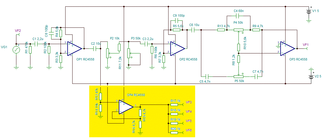 Csak egy kérdés. Említve volt, hogy a műveleti erősítő nem szereti a kapacitív terhelést. A C6 elé/mögé nem lenne jó egy kilos ellenállás sorban?