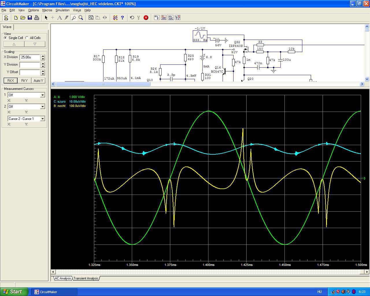 Nem reprodukálni akartam a kapcsolásod, csak megnéztem nálam mit mutat CM-ben szedett-vedett tranzisztorokkal.