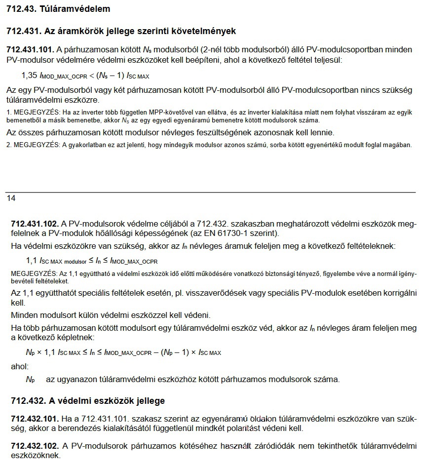 Teszek ide két pdf-et ezekben van hivatkozás a szabványra de ettől sem leszünk okosabbak. Itt egyébként azt írják, hogy ha a PV kábel el tudja viselni a PV zárlati áram 1,25 szeresét akkor nincs szükség PV oldali túláram védelemre. Meg teszek ide egy adatlapot is, elvileg ilyen paneljeim vannak bár nem vagyok benne biztos. Ott látszik, hogy a max árama 13,04A a zárlati árama pedig 13,85A+/-3%. Erre ugye nem lehet hagyományos biztosítót méretezni csak elektronikusat. Illetve használatban nem is az STC hanem a NOCT adatok a mérvadóak, előbbi inkább laborkörülmények között 1000W/m2 besugárzás mellet igaz. De a panel adatlapján is azt írja, hogy a maximum series fuse rating az 25A.