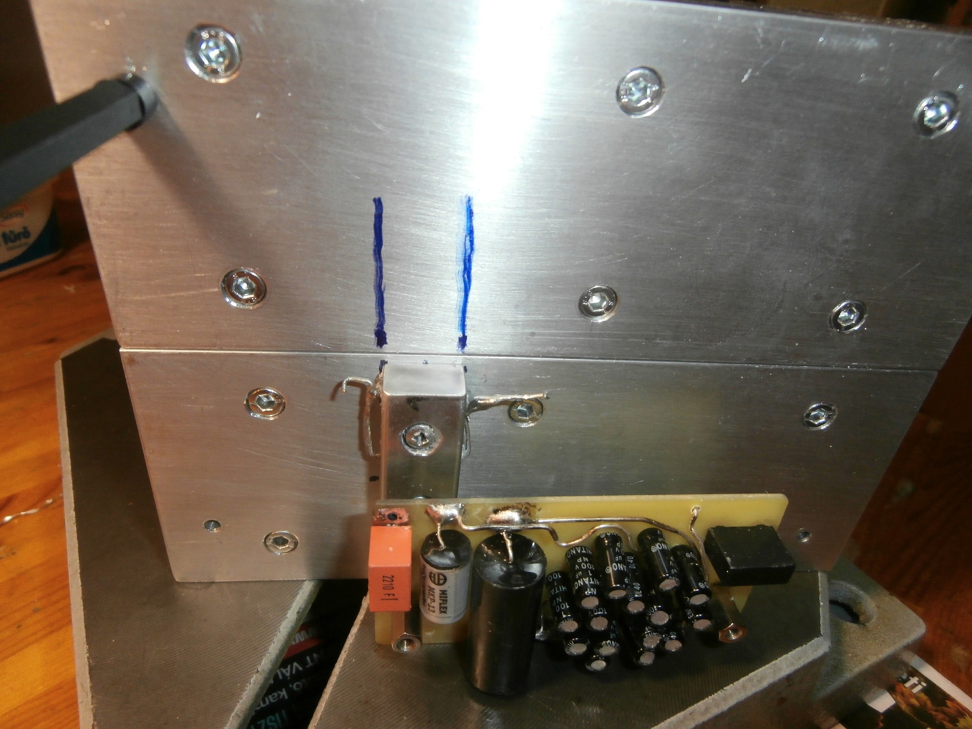 Az előzőekben említett okok miatt, és mivel már nem a régi a memóriám, egyben szerettem volna látni a panelt a bordával 3D-ileg. A panellel kezdtem a 2mm-es furatokkal. Az összeszerelt bordák hátától mérve, sublerrel húztam egy 4,8mm-es csíkot. Majd az elől-hátra kijelölés után a 2mm-es furaton pontosan tudtam átjelölni a keresztpontokat, és jöhetett a bordákon a pontozás. A bordákat a távtartókkal egybe hagytam a jobb felfekvés miatt a platnin, és így jelöltem fel, pontoztam, és fúrtam elő 2mm-es fúróval. Azért ezzel, mert jobban helyezkedett bele a pontozásba. Azonban vigyázni kellett a vertikális tengelyvonalra, mert a szerelvény súlya és a fúró mérete miatt a tengelyvonalba húzásra nem lehetett számítani. Így minden alkalommal figyelni kellett, hogy a fúró nehogy ferdén haladjon fúrás közben, a törés elkerülése miatt. A bordáknál az azokra szerelt hőpuffereket ezentúl a borda részeként említem, mivel már a hátlap részének számít. Szóval a bordákba egyenként 12db menet lesz vágva (2db M4-es, és 10db M3-as). A 2db M4-es alul a borda végein rögzítés céljából. Szintén alul, 3db M3-as a tehermentesítő „csokik” rögzítésére, a hátfalon 2db M3-as a VCSK-panel (vertikális) rögzítésére, és felül kettő M3-as a VCSKRZ panel (horizontális) rögzítése céljából. És végül a Drain ellenállások hűtőtömbjének, és a FET rögzítésére (vertikális) a hátfalon 3db M3-as. A panel furatait ezek után felfúrtam, az attól való elszigetelés miatt. Az M4-esekhez 6-ossal (a szigetelő alátéthez), a „csokikhoz” 5-6mm-essel célszerű.