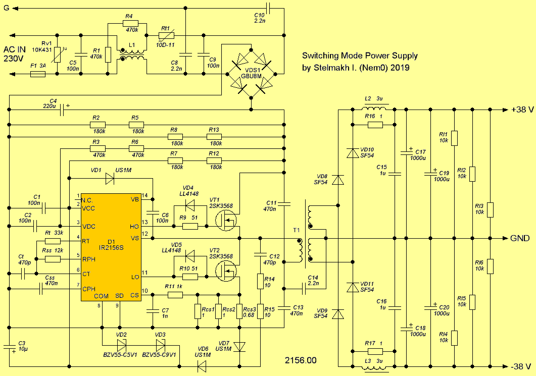 Van egy PR:O 15D erősítő modulom, ami bár működőképes, de gyalázatosan alulméretezettnek tűnik. Persze ezt a modul nem tudja, ezért szól mint a veszedelem. Ez egy kétutas aktív PWM erősítő. Minden ki van élvezve a végtelenségig, jó hogy bele nem hal szegény. A táp TOP262 IC-re épül, 2X75V-ot állít elő a két végfoknak, valamint néhány segédfeszt. A végfokok IRS20124s IC-re épülnek, 150V-os feteket hajtanak meg. Ezek csak fel vannak forrasztva a nyákra, ennyi a hűtésük. A kimeneti induktivitások 0,4mm-es huzalból vannak 2cm átmérőjű vörös toroid magon. Nekem így nincs rá szükségem, gondoltam átalakítom sztereó erősítőnek, de nem olyan egyszerű ahogy első körben hittem. Rajz nem lévén, visszarajzolva a lényeges részeket. Az Irs20124s az Irs2092-től eltérően nem analóg, hanem PWM bemenetű. A bemeneten egy szintillesztő diszkrét fokozat, amit egy ADAU1701 dsp előz meg. Ebből jön két csatornán a PWM jel, tehát az aktív kereszt váltó digitálisan működik. A Dsp előtt van egy előerősítő, ez a gain fokozat. Nos ez így nem opció számomra. Nem tetszik hogy azonnal digitalizálja a bemeneti analóg jelet, aztán abból csinál PWM jelet a félhíd meghajtóknak. A kimenetről semmi visszacsatolás, csak a Jóisten figyel a torzítás nem túl magas szintjére. A nyák többrétegű, vastag rézfóliájú, ilyet nem tudnék csinálni. Viszont a Dsp-t leválasztva lehetne önrezgővé tenni, viszonylag kevés külső alkatrésszel. Mivel a két végfok tápja közös és egymástól csak pár cm távolságban vannak, vélhetően a vivőket el kellene tolni egymástól 20-30kHz-re. Csakhogy önrezgő kapcsolás esetén a vivő nem állandó, hanem várhatóan 200-400kHz között fog változni. Azaz hiába eltolnám egymástól a két csatorna vivőjét, biztosan lenne olyan állapot, amikor a különbségi frekvencia a hallható tartományba esik. Van e tapasztalat ilyen közös tápos önrezgő erősítő hallható füttyögésével kapcsolatban?