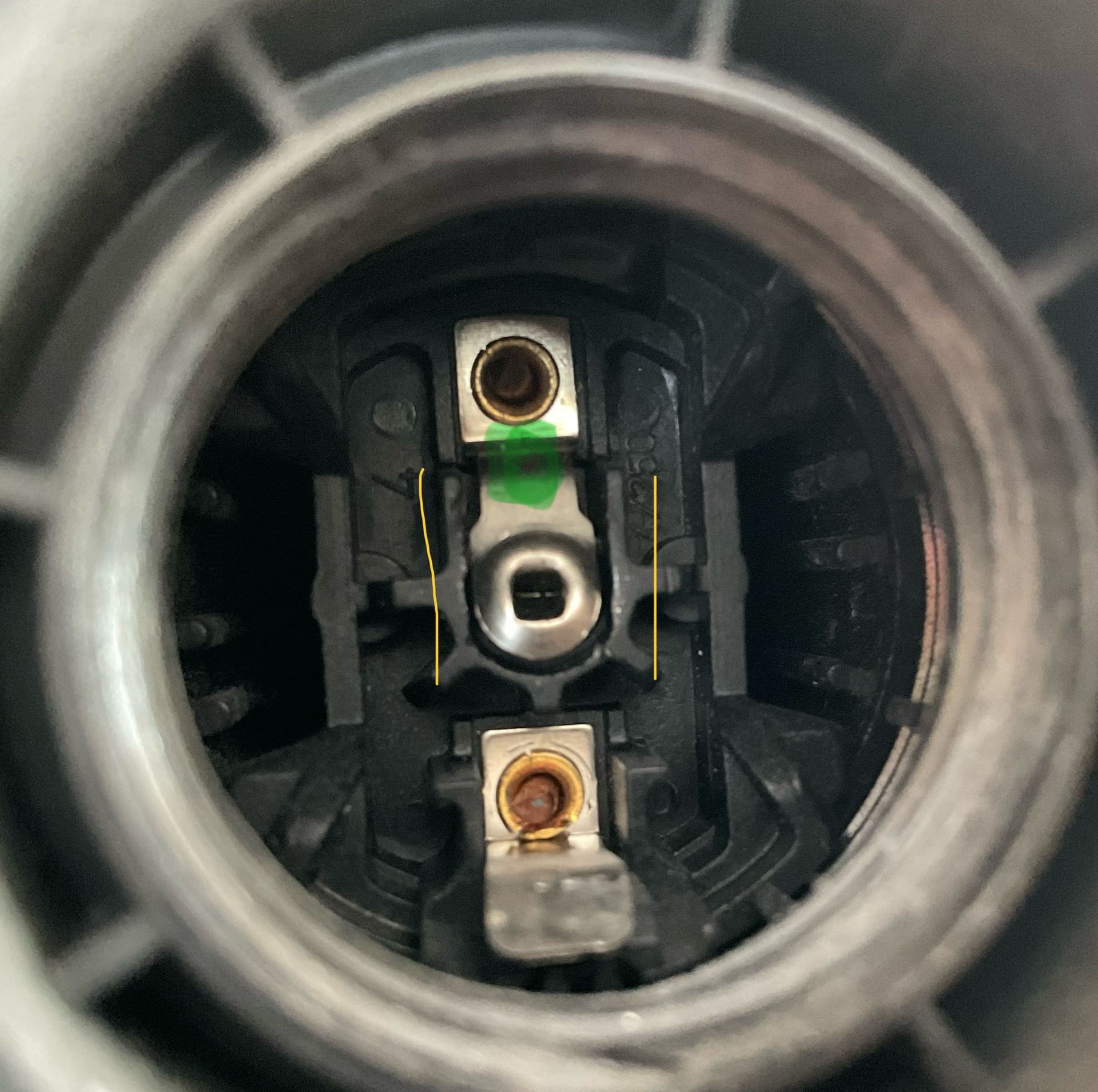 Mi a franc lett a korábbi foglalattal, nézegetem a kontaktust a foglalat mélyében két kis müanyag falacska közé süllyedt fém felület. Azaz eleve nem érhet az izzohoz. Semmi olvadást, semmi deformálodást nem látni.az izzot pontosan emiatt müanyag pöckök miatt nem lehet mélyebbre csavarni. Piszkálgatom a kontaktust és látom, hogy az a kis V alaku lemezke leolvadt a másikrol ahova valoszinüleg oda volt forrasztva. Akkor nézem, hogy a foglalat csak 60W-s izzohoz ajánlott. Netalán ez a forrasztás vagy megoldás biztositék vagy mi a szösz? Az igaz, hogy 150W isszo volt benne ( és nem elöször) és ritkán volt 2-3 percnél tovább bekapcsolva igy nem igen lehetett nagyon tulmelegitve. ( de az eredeti IR lámpában is ilyen müanyag foglalat van, csak az fehér.). Igy valoszinüleg kidobtam egy jo IR izzot. A képen a 2 sárga vonal melletti részk közé süllyedt a kontaktus ami zöld pöttynél belül volt kb 2 mm vastag cinnel a bemeneti polushoz forrasztva. Ha ez kiolvad, akkor a kontaktus elmerül a müanyag falak közé, és nem világit az izzo.