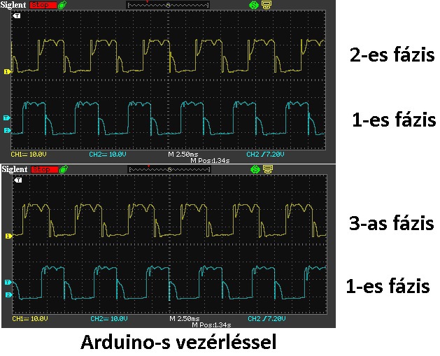Most sikerült végre elindítanom már a motort az eredeti vezérlővel, de arduino támogatással, ezt sikernek könyvelem el. Nem volt egyszerű párszor azt hittem kinyírtam a FET-eket, mert motor nélkül is zárlat volt, kiderült, hogy rosszul vezéreltem ismételten a FET-eket, majd a BEMF áramkörnél amit csináltam rosszul kötöttem be a dolgokat, illetve gondolom a hőmegfutás /forrasztás/ miatt kinyírtam pár 2k2-es smd ellenállást is... Találtam egy BEMF vezérlésű arduino programot, ezt sikerült hellyel közzel összerakni, és már elindul a motor, bár alacsonyabb fordulatszámon elég sok áramot vesz fel, illetve lehet az is közrejátszik, hogy a labortápom bár 5A-es, de max áramkorlát mellett be be villan néha. Nem is bírja rendesen az induktív fogyasztókat. Csatolok 1 képet a fázisokról most, nem tudom mi a következő lépés. Üresjáratban olyan 2, 2.5A-ert fogyaszt kb 18V-on, szerintem ez sok és szerintem gyengécske is, bár nagy fordulaton nem mertem lefogni. Nem tudom, hogy a vezérlés buta, vagy valami még hibádzik.. ![]() Ezt a programot használtam kis módosításokkal. A hozzászólás módosítva: Jún 25, 2022