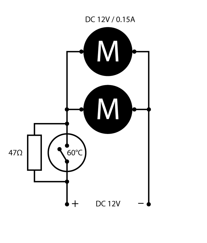 Akkor ha jól értem, egy ellenállás közbeiktatásával csinálnék egy bypass-t. A hőkapcsoló nyitott állásában, 60 fokig, a bypass-on keresztül kapna csökkentett tápfeszt a két ventillátor, 60 fok alatt csak fél,- negyedgázon menne. Ha bekapcsol a termosztát, akkor onnan fullgáz. Lefirkantottam, hogy jól értettem-e. Trimmer potival nem lenne egyszerűbb az élet?