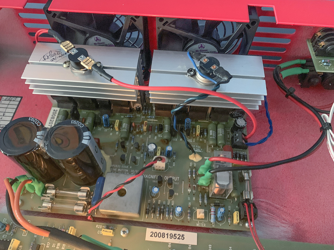 Tegnap a szellőzőrésen bedugtam a hűtőbordára a multiméter hőfokmérő szondáját, hogy megtudjam, menet közben mi újság van odabent. Kikapcsolt állapotban a hűtőbordán 19 fokot mértem (a szobában 22 volt). Bekapcsolva és egy 20 perces, a szobahangerőnél nagyobb hangerővel történt brummogás után sem bírtam 25 fok fölé erőltetnem. Azt is csak akkor, ha slapp-el úgy megcsaptam a húrt, hogy a bemeneti jelszintet mutató VU-meter belenyalt a pirosba. Ha letettem a gitárt, fél perc alatt visszahűlt 20 fokra. Nyilván, ha a végfoktranyóra tudtam volna rakni a mérőszondát, ott többet mutatott volna, de ahhoz szét kellett volna szednem. Szóval arra jutottam, hogy ez egy ízig-vérig színpadi cucc, már a méreteiből is lehetett erre következtetni. Ez arra van tervezve, hogy kint izzadjon a színpadon. Azzal nem foglalkoztak, hogy ezt valaki szobahangerőn is használná és ott felesleges a tornádó. Nagyon szépen kifutja magát szobahangerőn is, de ezt túlhűtés nélkül, éberkómás állapotban is lazán teljesítené.