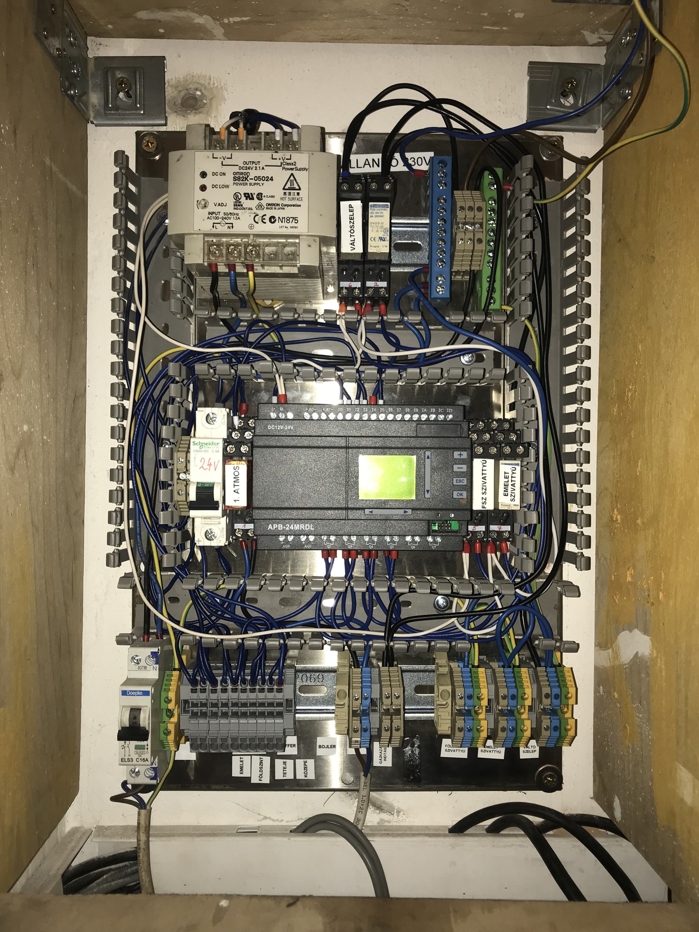 Na, tegnap össze is kanócoltam a 99%-át a dolognak (a doboz elejére kell még szerkesszek egy ajtót, abba fog beleülni a három digit-termosztát, meg három kapcsoló, hogy a szivattyúkon és a gázkazán indításon tudjak csinálni manual override-ot (pl ha légteleníteni akarok, vagy ilyesmit, akkor innen tudjam direktben kapcsolni a vezérlésen kívülről ezeket a komponenseket)), meg persze minden bejövő jelet (szobatermosztátokat, digit termosztátok kapcsolóit) a bemeneti sorkapcsokba bedugdosni, meg a kimeneteket (szivattyúk, kazán, váltószelep) is bedugdosni a helyükre.