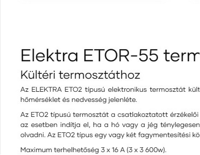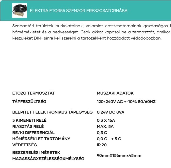 ETO2G TERMOSZTÁT MŰSZAKI ADATOK TÁPFESZÜLTSÉG 120/240V AC +-10% 50/60HZ BEÉPÍTETT ELEKTRONIKUS TÁPEGYSÉG 0, 24V DC 8VA 3 KIMENETI RELÉ 0, 3 X 16A RIASZTÁS RELÉ MAX. 5A BE/KI DIFFERENCIÁL 0, 3 C HŐMÉRSÉKLET TARTOMÁNY 0, 0 C - + 5 C VÉDETTSÉG IP 20 BESZERELÉSI MÉRETEK MAGASSÁGXSZÉLESSÉGXMÉLYSÉG 90mmX156mmx45mm |