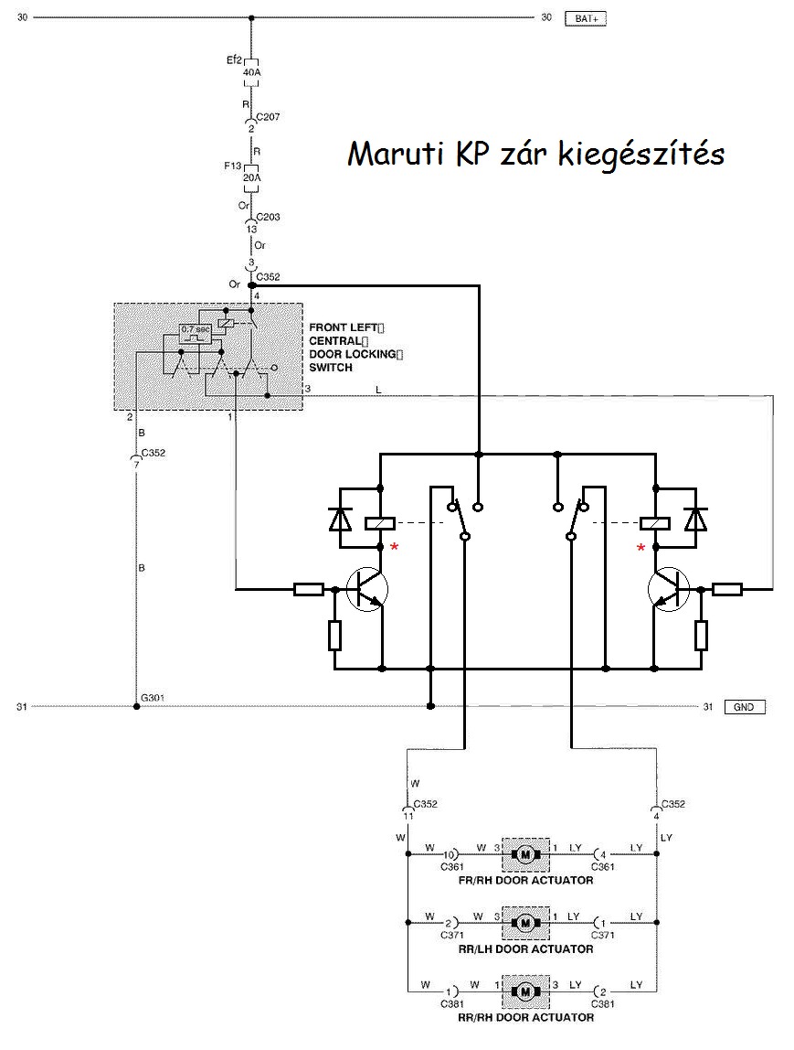 A piros csillaggal jelölt pontokra felváltva testet adva kívülről is működtethető. Tehát ide kell majd kötne a testet kapcsoló vezeték nélküli vezérlőt. De előbb legyen meg a kis panel a relékkel és működjön normálisan. Amire figyelni kell, hogy ha fordítva zár és nyit, akkor meg kell cserélni az L és W vezetéket a bemenetén. Elsőre a vezérlős bal elsőbe ne legyen bekötve a motor, mert fordított működés esetén ott ciriburi lesz...a többivel ellenőrizhető. Aztán már csak ezt kell jól bekötni. A vezeték nélküli (és amúgy a sima vezérlőknél is így lenne) vezérlőnél a negatív trigger szerinte kell kötni. Itt is fenn áll a fordított működés esetén a vezeték csere a csillaggal jelölt pontoknál. |