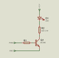 Lásd melléklet. R1 értéke 1 - 4.7 kΩ, ami kéznél van. Tranzisztor szinte mindegy, milyen. R2 értékét módosíthatod LED-től függően. Előtét számoló: LED előtét ellenállás (Soros LED).