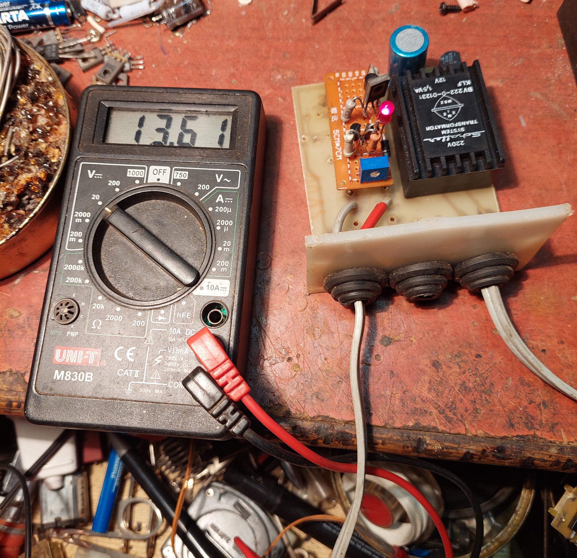 Az az egyetlen baj, hogy (a fényképeden mutattad is) 12V-os a trafó. Az pedig a 1,5VA-t kívánva (kb120mA) már nem fog 12V felé menni, kicsivel kevesebb áramnal kicsit felfelé is fog menni. (És olysnkor is csak a "szinusz" felső részén tud tölteni) Terhelés nélkül sokkal többet íger, valóban.