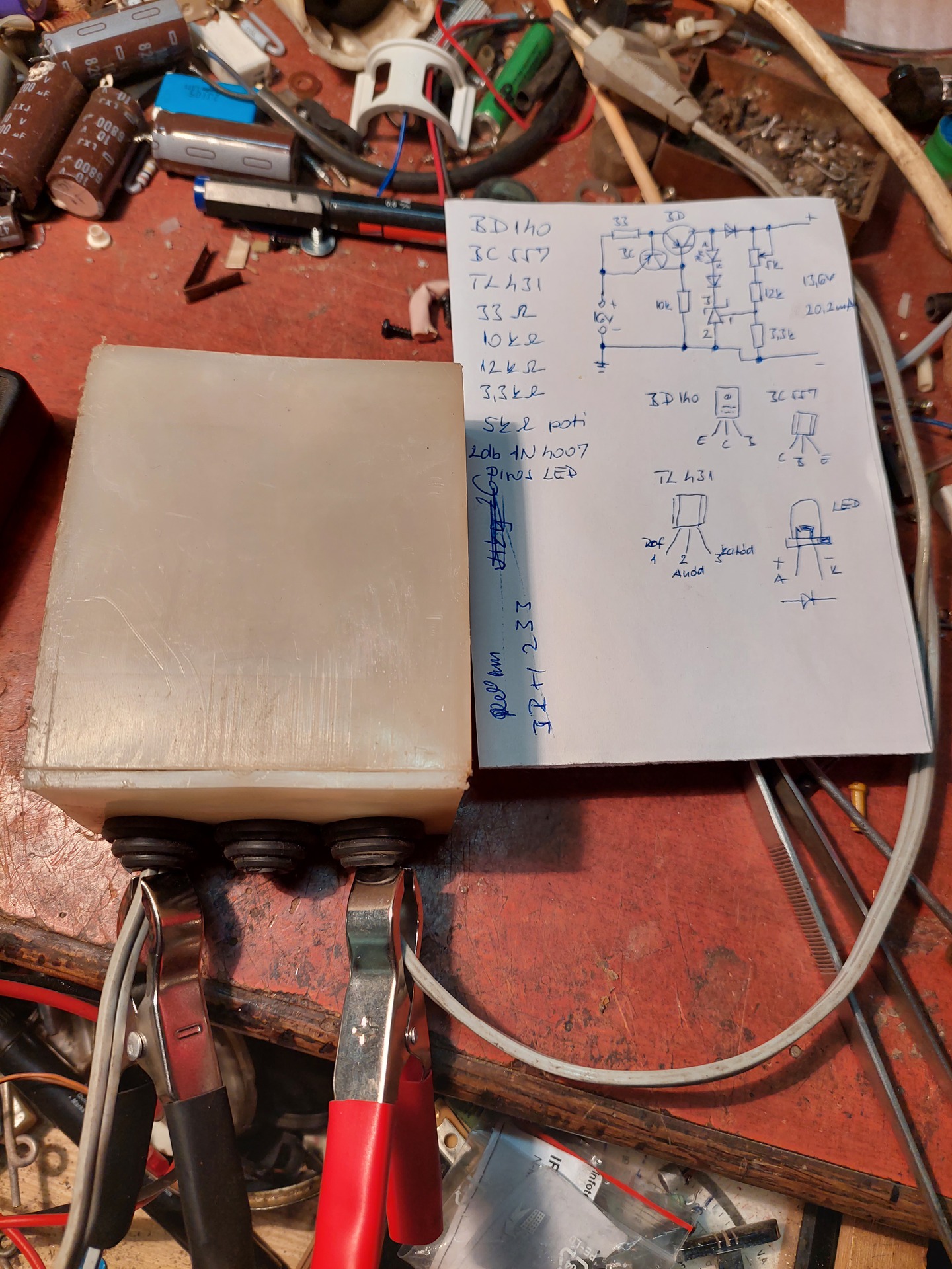 Nem kell hűtőborda, sem 1-2W-os ellenállás sem. Minden lehet 0,6W-os. A kimenetre teszel egy kondit és beállítod a kívánt feszültséget. Aztán jöhet az akksi.