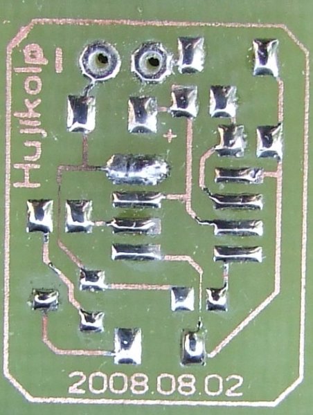 SMD kivitelben a mellékleten Sajnos egy helyen elszakadt a nyákon a vezeték, kicsit elkapta ott a sav, ezt a kék vezetékkel pótóltam ki. Első SMD forrasztásom, de elsőre sikerült működésre bírni