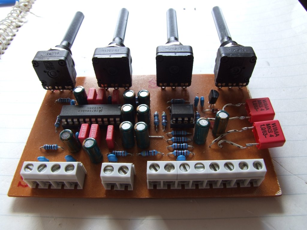 Elkészült az előerősítőm mély, magas szabályzás + balansz. Ugyanaz ami kit formájában több helyen is kapható LM1036 IC-vel. A nyákot ujraterveztem kapcsolásirajz alapján (HE 2003/02). A két 1µF-os fóliakondi azért van dróton mert a nyákon 5mm-es lábtávolságra terveztem, de az üzletbe csak 7.5mm-es volt készleten... ha kapok valahol 5mm-est majd kicserélem.