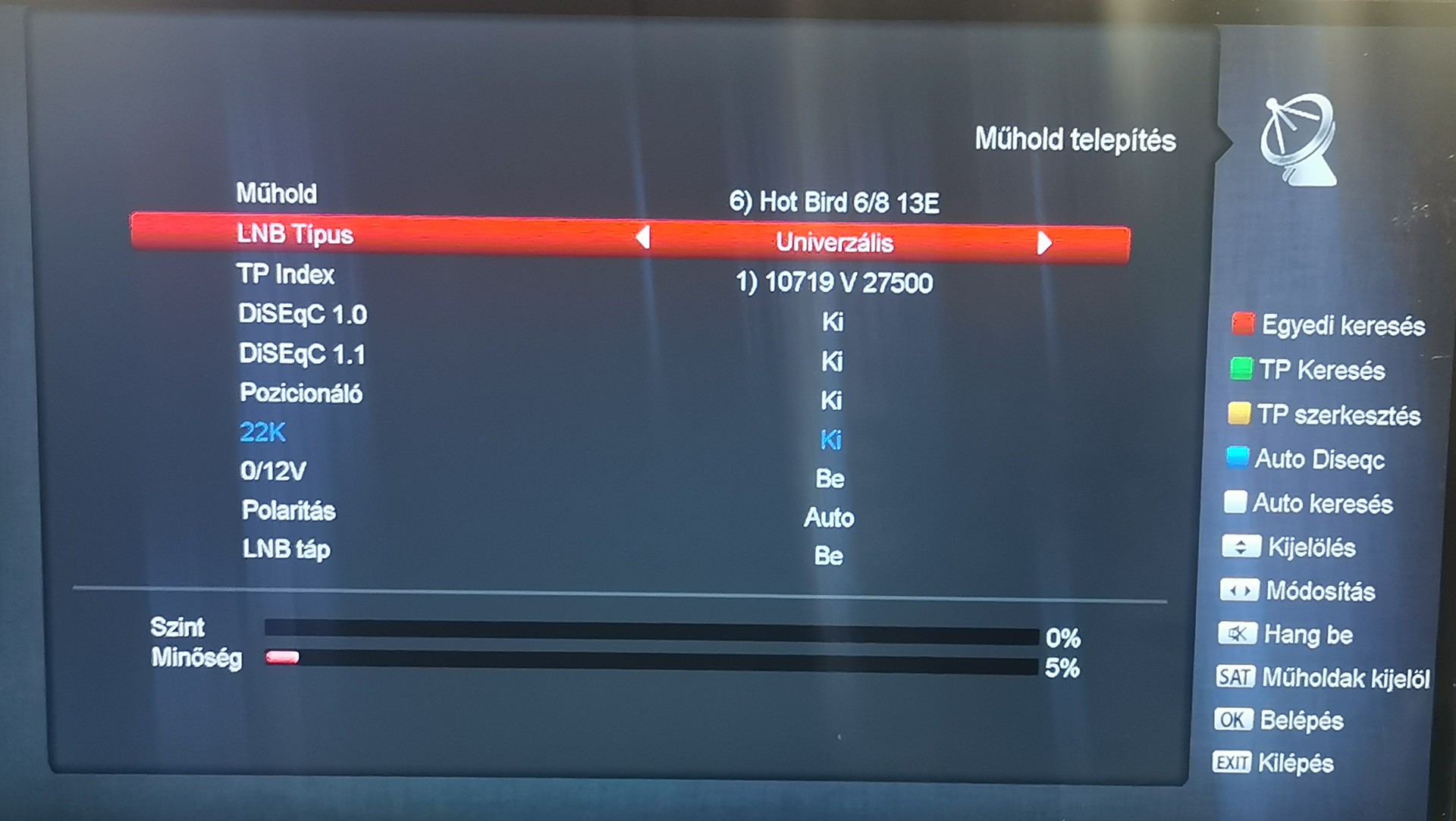Addig mozgasd a tükröt, míg a jelszint-minőség csíkon nagyobb kiugrást látsz. Ebben a menüben ne állíts el semmit sem.