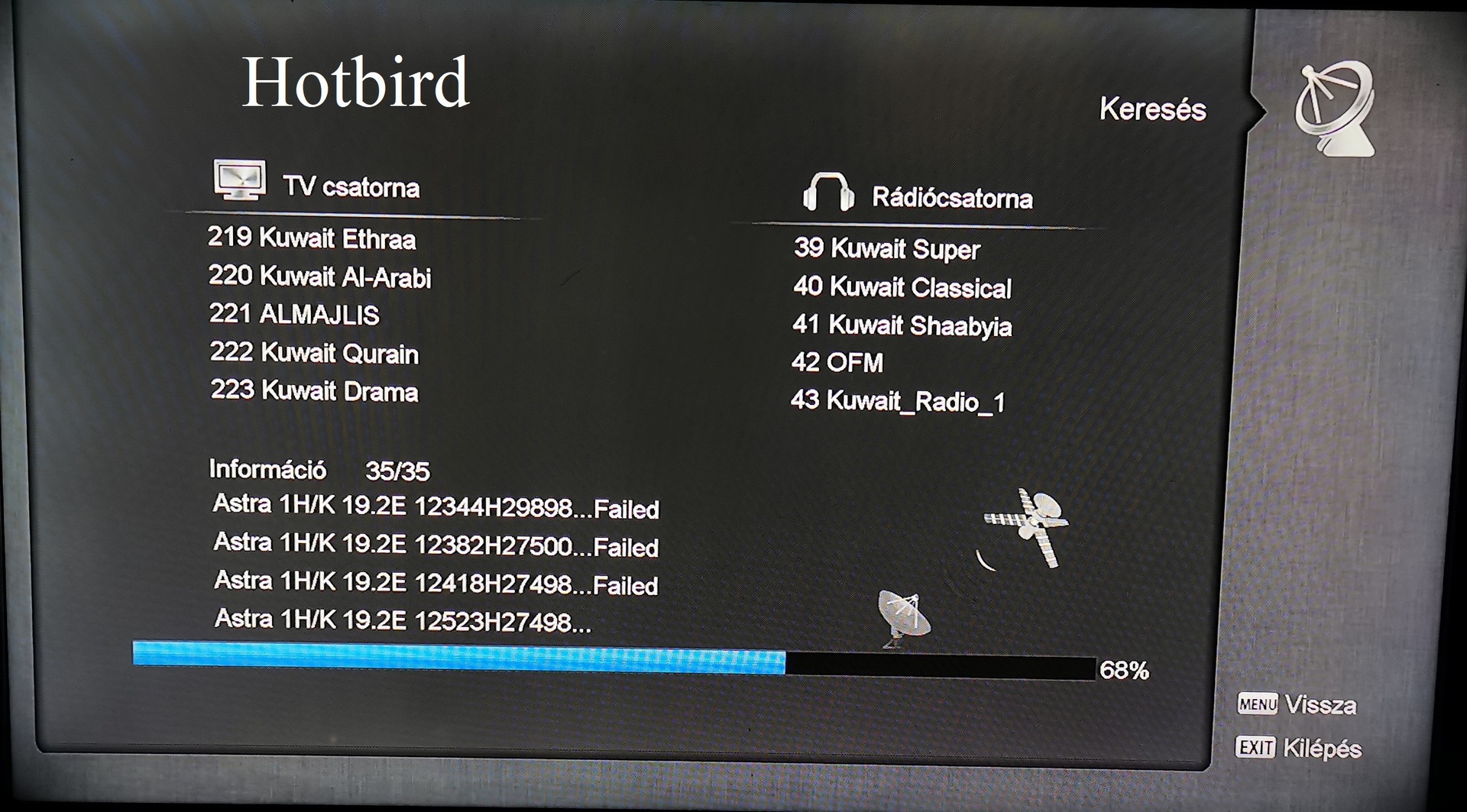 Én úgy látom, hogy a Hotbird fejjel vételezed az Astrát. Ha szemben állsz a tükörrel, akkor melyik fej van az Astrára állítva? Már csak azért is ez a gyanúm, mert a kuvaiti csatornák a keleti 26 fokról jönnek.
